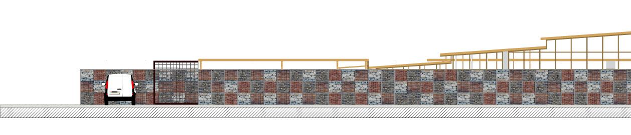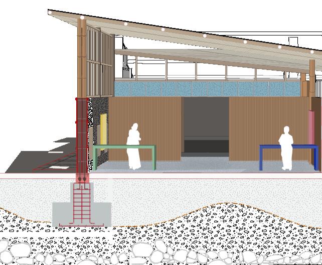 El sistema estructural se compone de elementos de bambú anclados al terreno mediante pequeñas zapatas que permiten su estabilidad y contacto controlado con el suelo. La estructura se arma a partir de amarres que conectan los elementos verticales y horizontales, conformando el soporte del techo. Para asegurar la rigidez del sistema, se incorporan elementos diagonales de bambú que funcionan como arriostramientos entre los soportes principales.