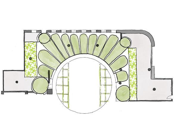 Planter Detail incorporated with furniture Plants to be swapped out seasonally. Organic Petal ceiling