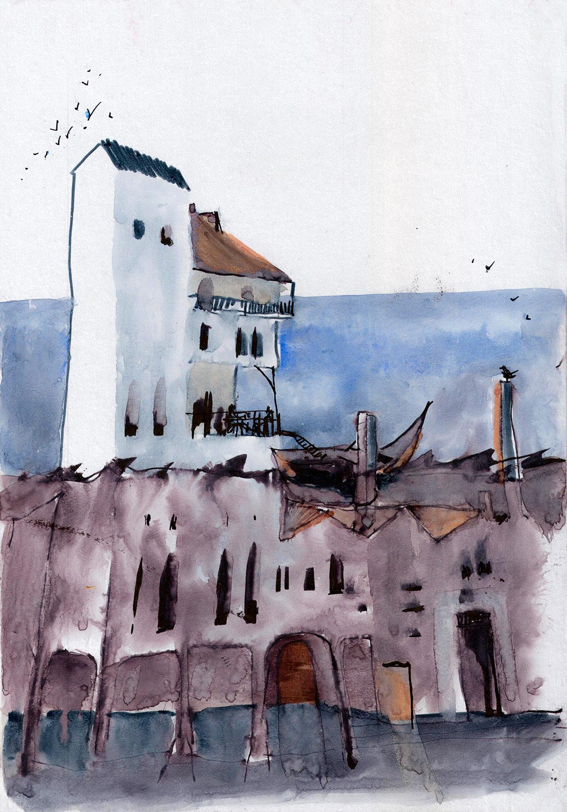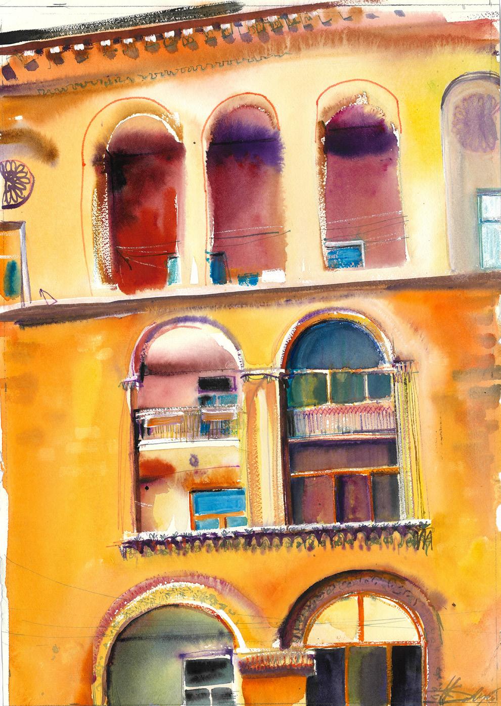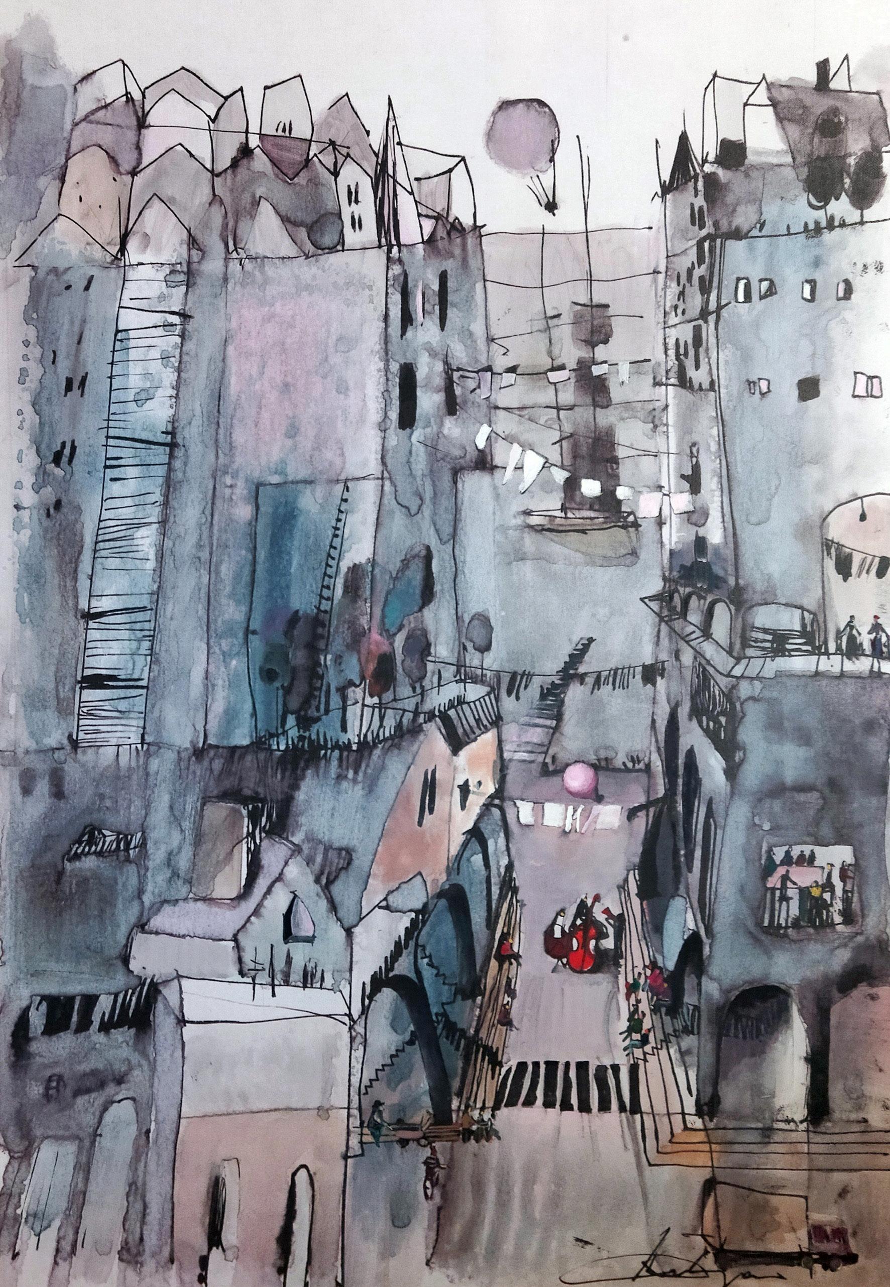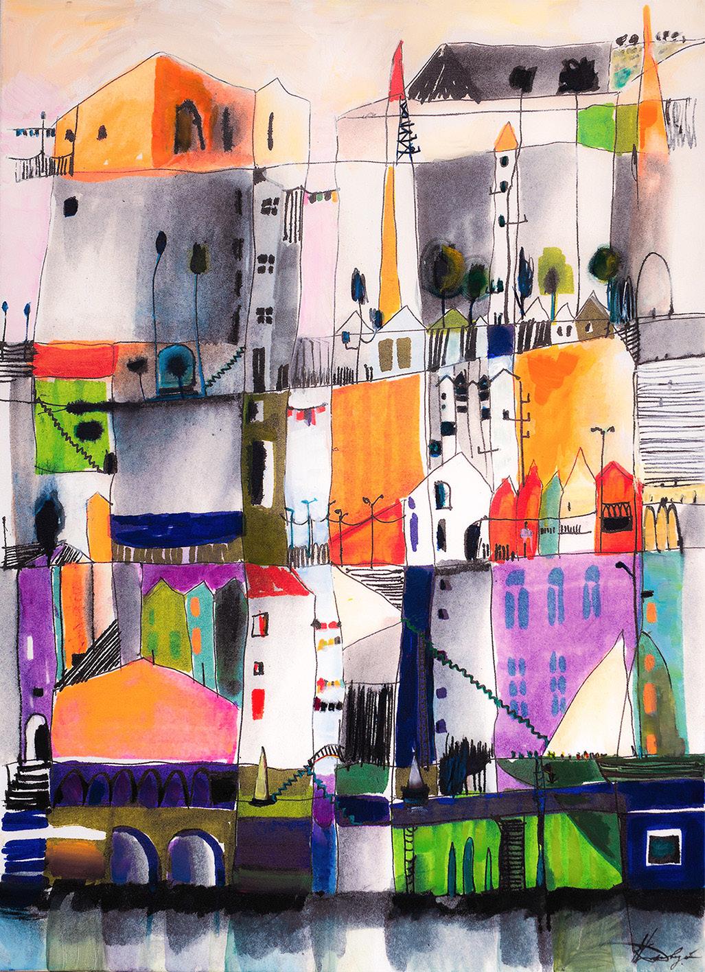 She works with watercolor, acrylics, ink, pastel, pencils, and other media. She is praised for the visual variety of her artworks, and the pleasant feelings they bring to people. Her works contain all her experiences as an architect, urbanist, traveler and are soaked with her childhood memories and dreams. Her main strength is seeing the beauty in the surrounding world and helping people see it as well.