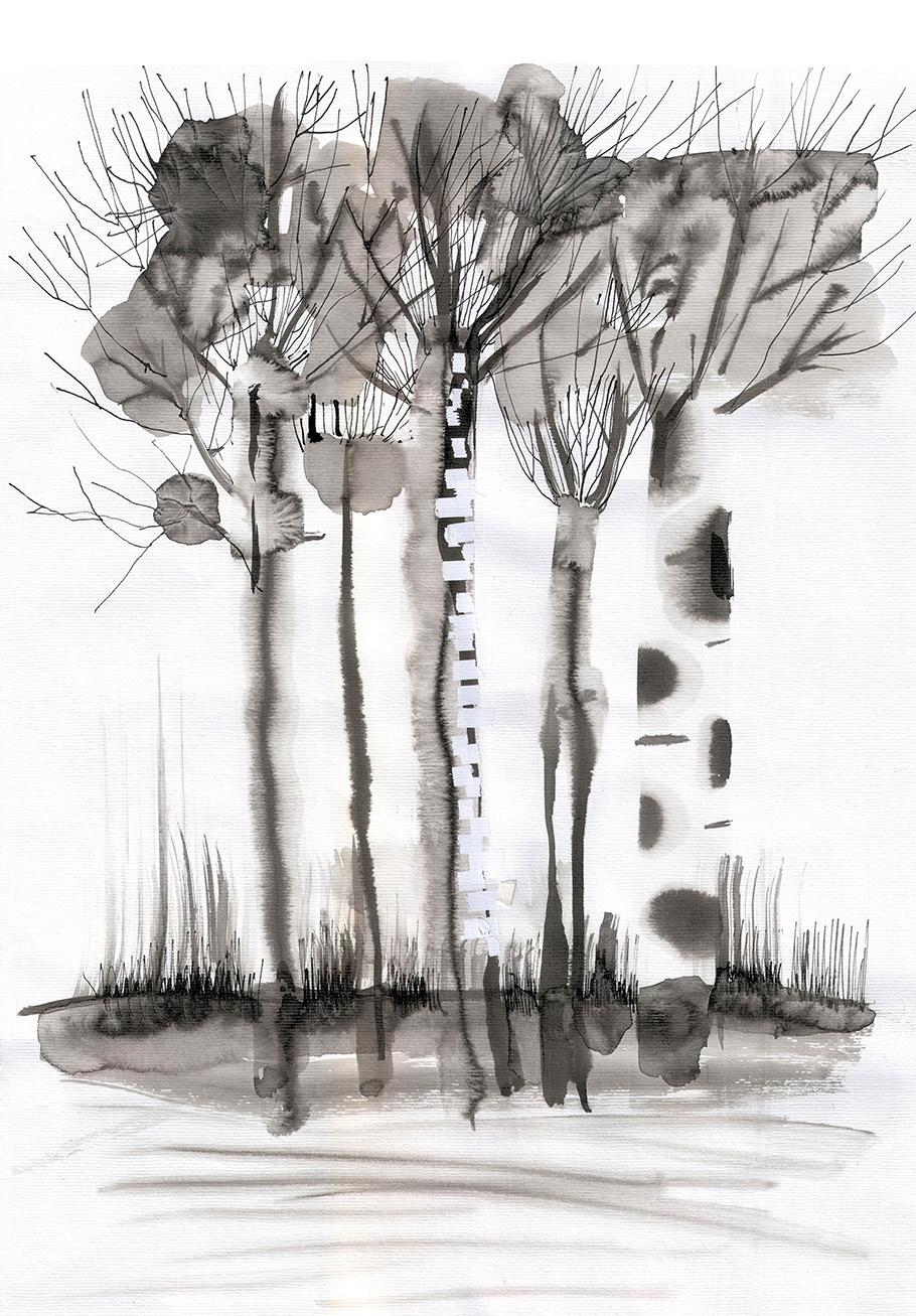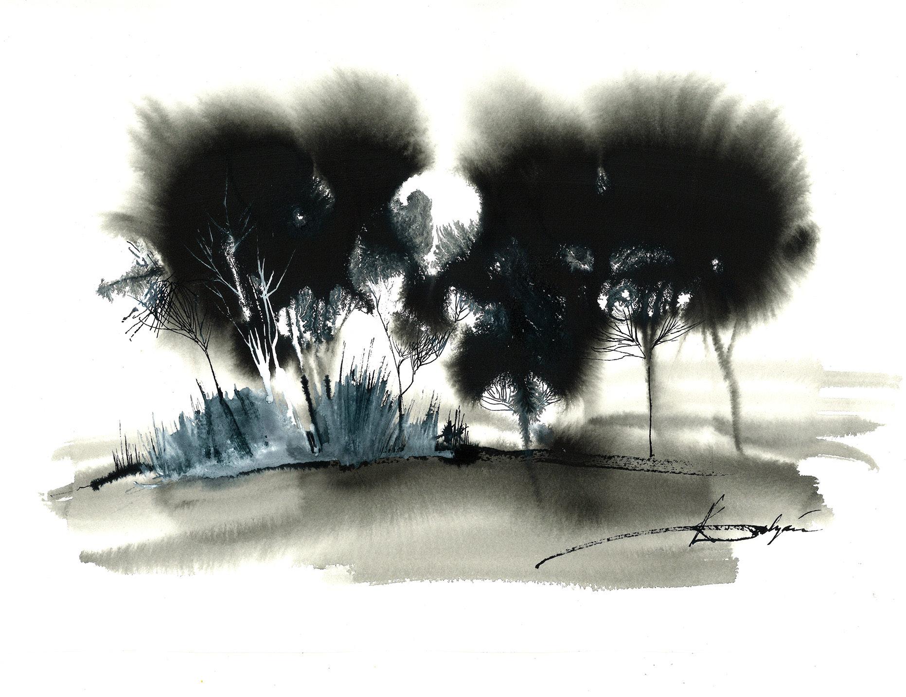 I also have a deep passion for ink and monochrome pain�ng. Every now and then, I enjoy narrowing down my focus to tones and limi�ng my use of color. I'm par�cularly fond of the unpredictable way ink flows in water. There are �mes when I simply drop ink onto wet paper, and it's only then, based on what I see, that I decide what the artwork will become. It's a deligh�ul process.