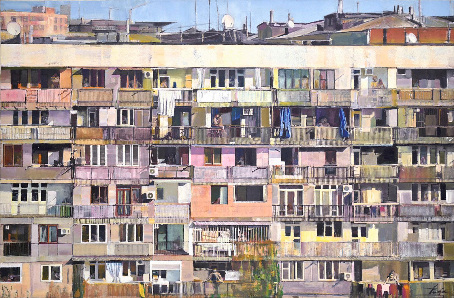 Many of the buildings from the former Soviet Union were constructed using prefabricated blocks of repe��ve elements, and this par�cular condominium is no excep�on, made from reinforced concrete panels. In Armenia, people o�en use whatever materials are readily available to remodel or expand their condo apartments, taking advantage of a rela�vely lax enforcement of urban codes. As a result, the facades of these buildings, which are inherently divided by the grid of prefab panels, evolve into a picturesque patchwork that showcases the individual owners' tastes and financial capabili�es.