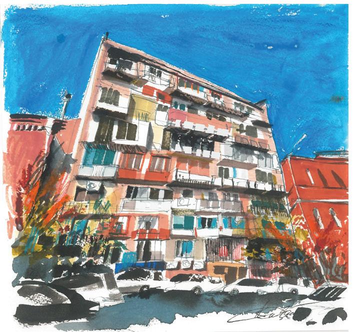 I chose to paint an exis�ng building that appears commonplace and familiar for the inhabitants of my town. Within this pain�ng, I've portrayed beau�ful moments of lovemaking, some overtly visible and others concealed deep within the apartments, encouraging viewers to engage in their own interpreta�ons.