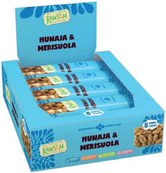 Rawsom pähkinäpatukat 40 g Luonnollinen ja rapea pähkinäpatukka sisältää laadukasta energiaa. Makeutettu hunajalla. Ei lisättyä sokeria. Maidoton. Gluteeniton. Kosher