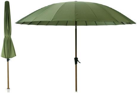 Pehmeän muotoinen aurinkovarjo, jonka runko on alumiinia ja kangas polyesteriä. Korkeus 244 cm. Varjon halkaisija 265 cm. Väreinä tumman vihreä ja ruskea. Valikoimissa esiintyy myymäläkohtaista vaihtelua. Y, L, J, O, I, .com