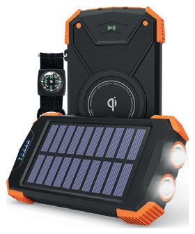 10 000 mAh varavirtalähde. Aurinkopaneelilataus ja taskulampputoiminto. Kompassi ja IPX4 roiskevesisuojattu. USB