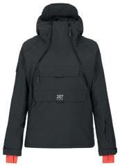 Rintatasku edessä. Hiihtokorttitasku. Lumilukot. Kankaan arvot: vedenpitävyys 15000mm, hengittävyys 15000g/24h teipatuilla saumoilla.