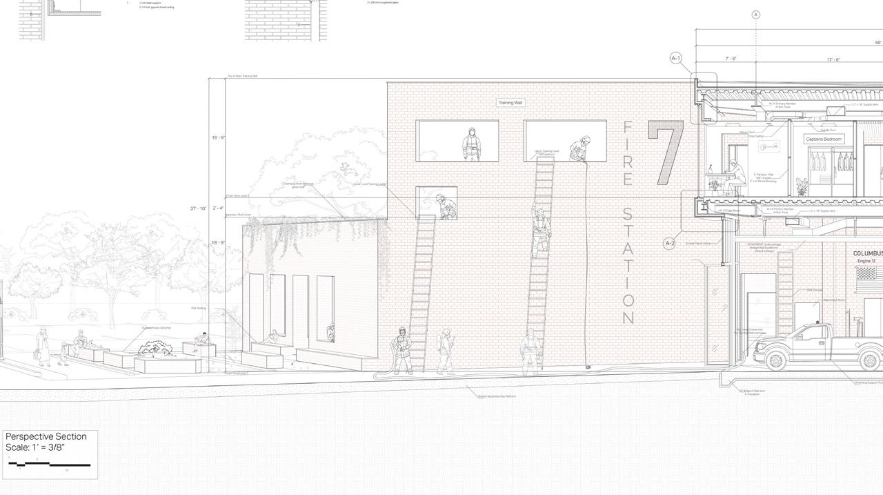 Ultimately, these main walls serve to split the live/ work spaces so both are divided, but easily accessible for rapid response times. This creates a healthy separation between the two vastly different programs without harming response times. In visiting local fire stations and talking with fire fighters their biggest requests were for access to natural light, outdoor spaces, and better separation of work/ life without compromising response times. These qualities are commonly overlooked in most firehouse designs in favor of efficiency and cost benefits at the expense of firefighters health. As such, this project was all about creating a hyper efficient box that required constant negotiation and massaging of program and layout to create a balanced project of both wellness and efficiency.