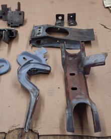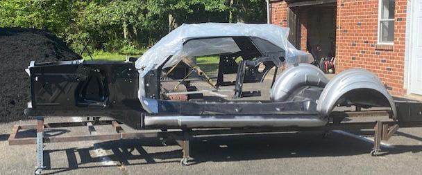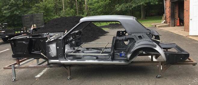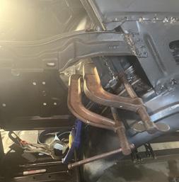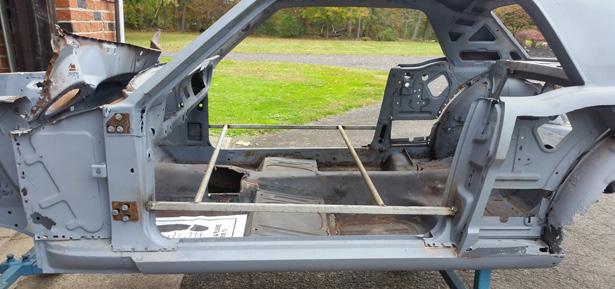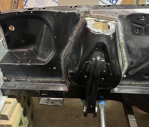 Fit, fitment and installation of new front frame rails, torque boxes, side cowl panel, and fire wall panel. All of which have been modified to fit both the new floor pan and the existing structure from the original car