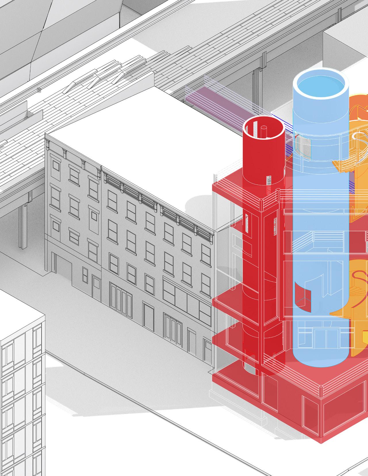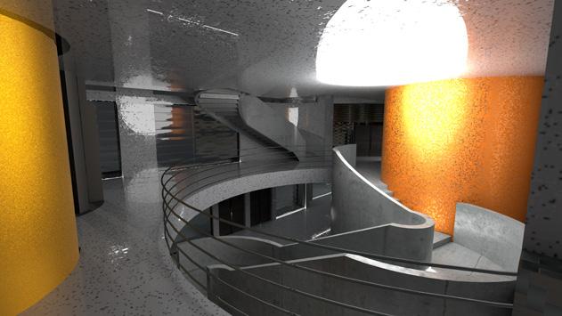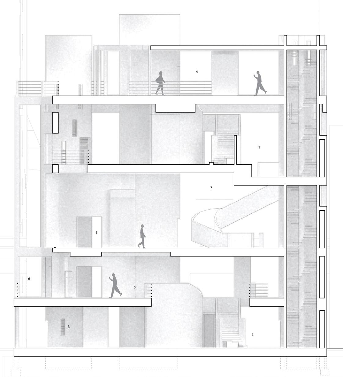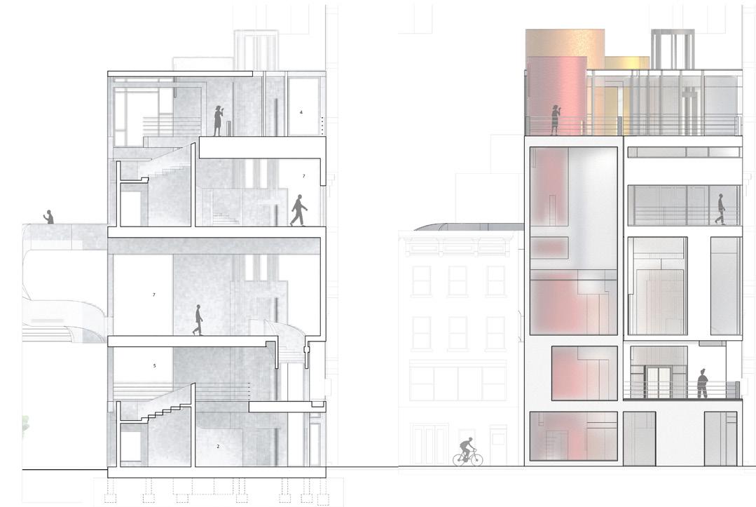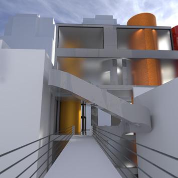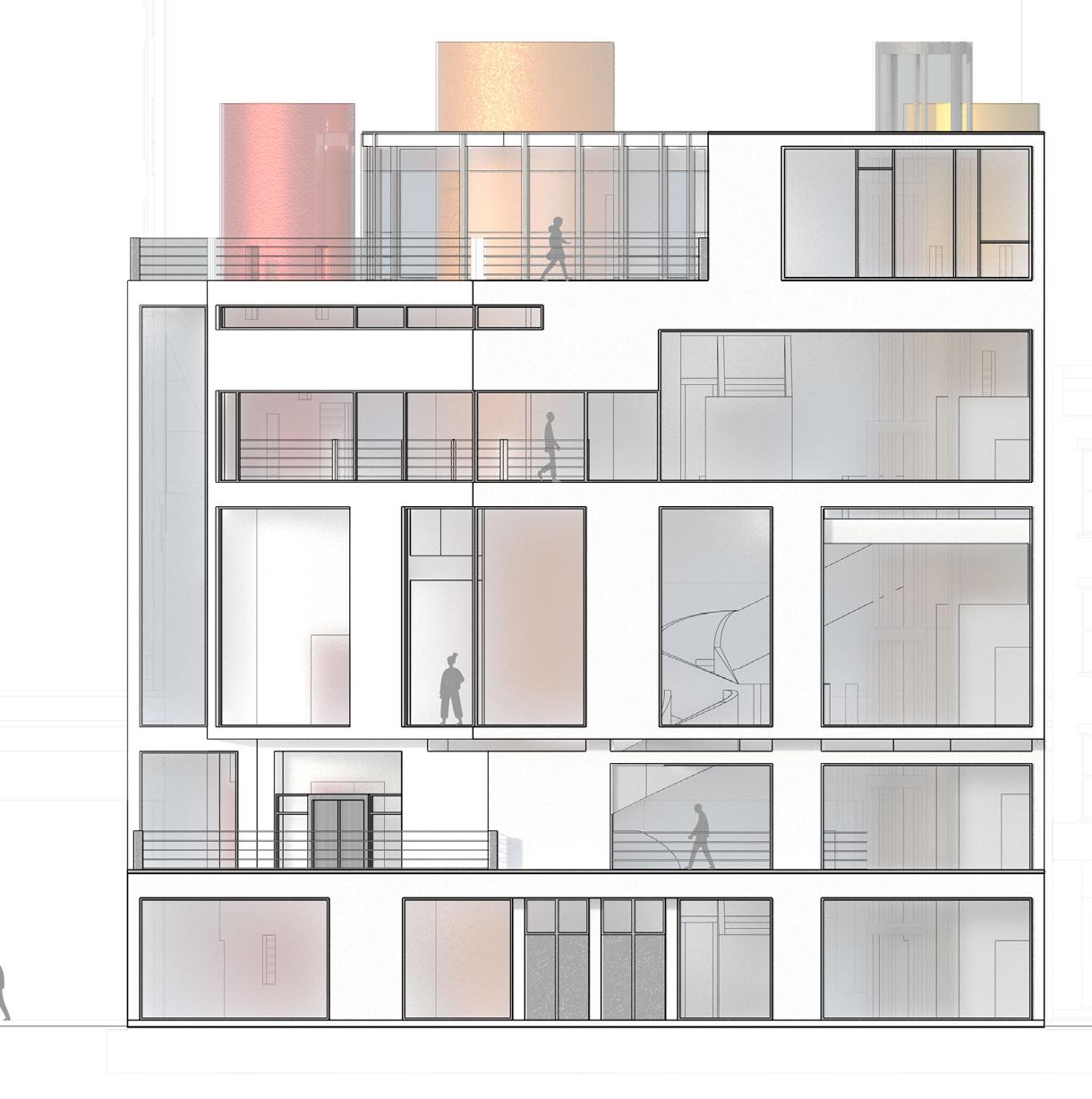 Curvilinear forms were then added, connecting the floors though sculptural staircases and cylindrical volumes that house elevators and fire stairs. These forms punch through the rectilinear building form too interconnect each level both visually and physically through circulation. These interconnects between the various levels of gallery spaces allow for a continuous flow between gallery spaces.