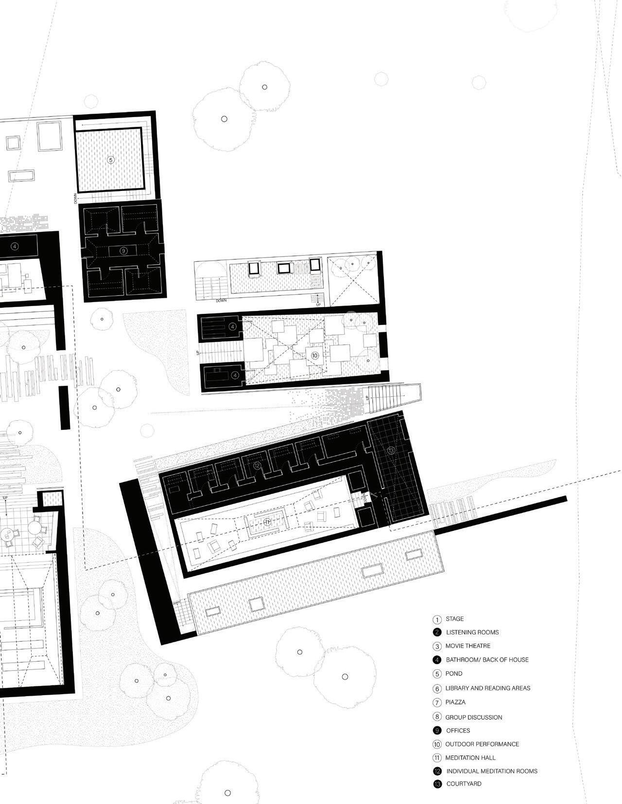The use of stereotomic forms were chosen to create spaces for people to experience private, safe spaces which are in stark contrast to the first reception centers. The program on site is divided into three groups: performance, mental health, and reflection. One axis on site accommodates mental health and performance spaces while a tilted axis contains reflection spaces. Traveling from the top of the site down to the ocean, programs gradually shift from more social to individual until you reach the small individual reflection space. These final two spaces of reflection house the Axis Block, which is the center point of vectors leading back to the countries where most migrants of Sicily travel from, and the final Reflection Block that overlooks the Mediterranean Sea by which many have traveled.