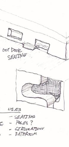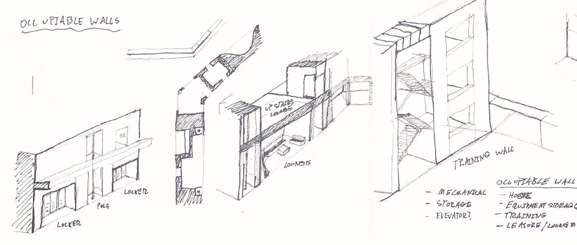 Through iterations of study models, the formal language of the wall was decided on as the main organizing element. This element functions as something more than a wall and is used to contain circulation, storage, training equipment, and program serving as the infrastructure to an infrastructural program.