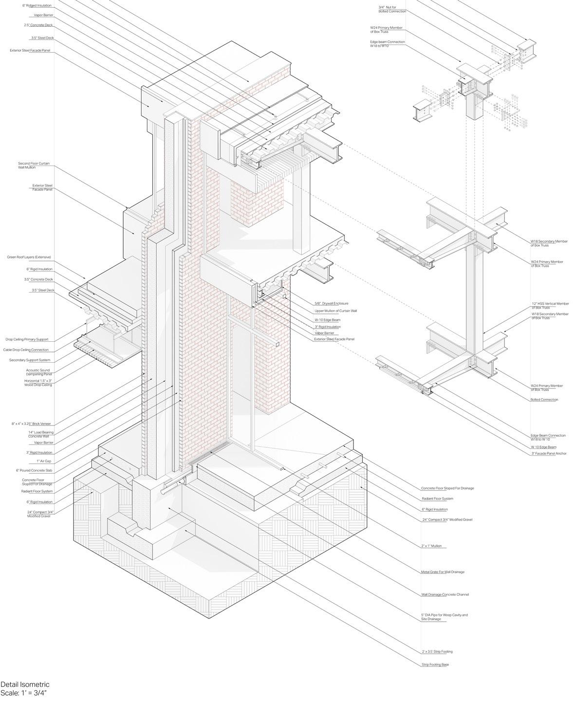 After meeting with structural and facade consultants, a detailed chunk model was developed to show how all of these elements combined to create enclosure. It also highlights how all of these systems connect, interact with the main element of the wall.