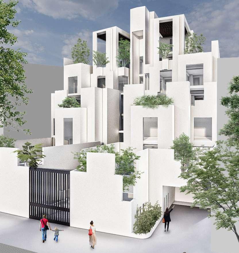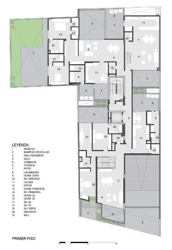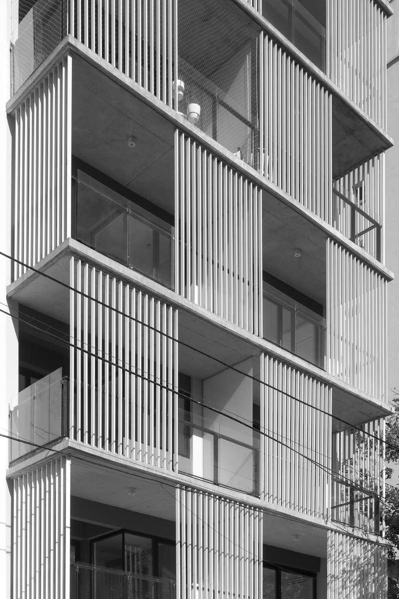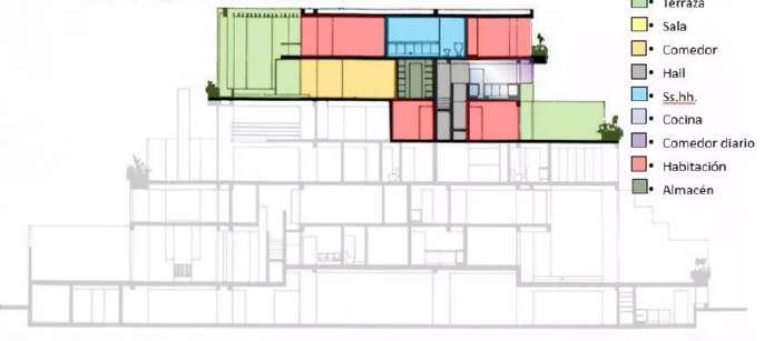 El segundo volumen es más vertical, alberga los dormitorios principales y el tercero retranqueado, sigue paralelo a línea del lindero frontal, este último es un dúplex ubicado en el quinto piso y la azotea.