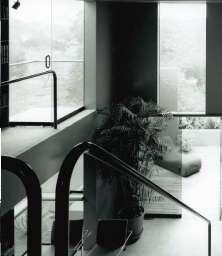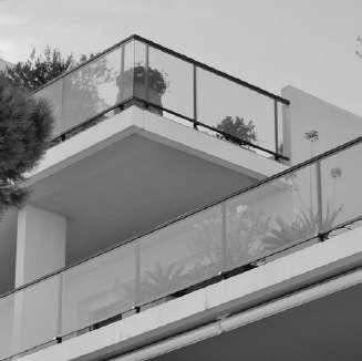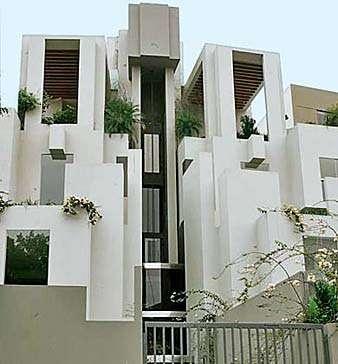 La fachada posterior para evitar el registro visual a la embajada vecina, presenta unos aleros laterales de concreto en las ventanas de los dormitorios.