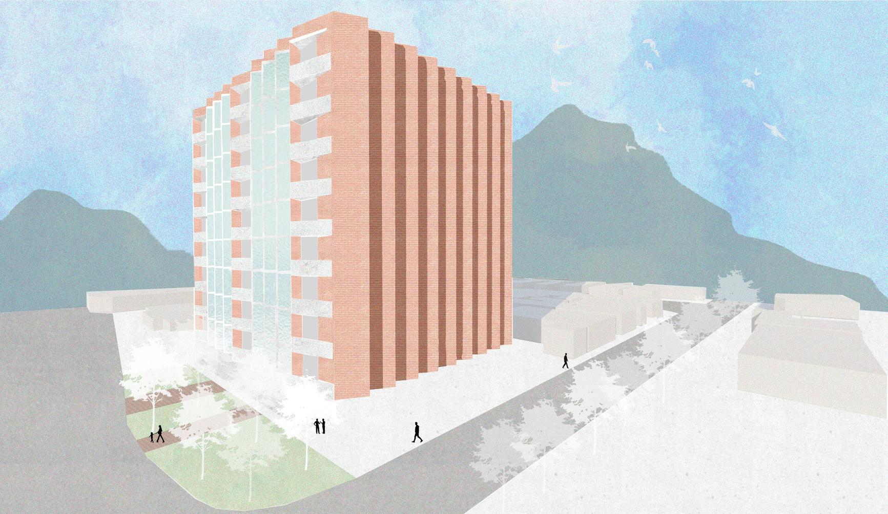Edificio departamental ubicado en la calle Fernando Montes de Oca Son departamentos para estudiantes de Universidad y cuenta con distintos tipos de habitaciones, tanto individuales como dobles El proyecto se desarrolló por medio de un estudio del análisis de sitio, como asoleamiento y vistas en su mayoría, se explicó el por que de cada fachada por medio del diagrama siguiente: