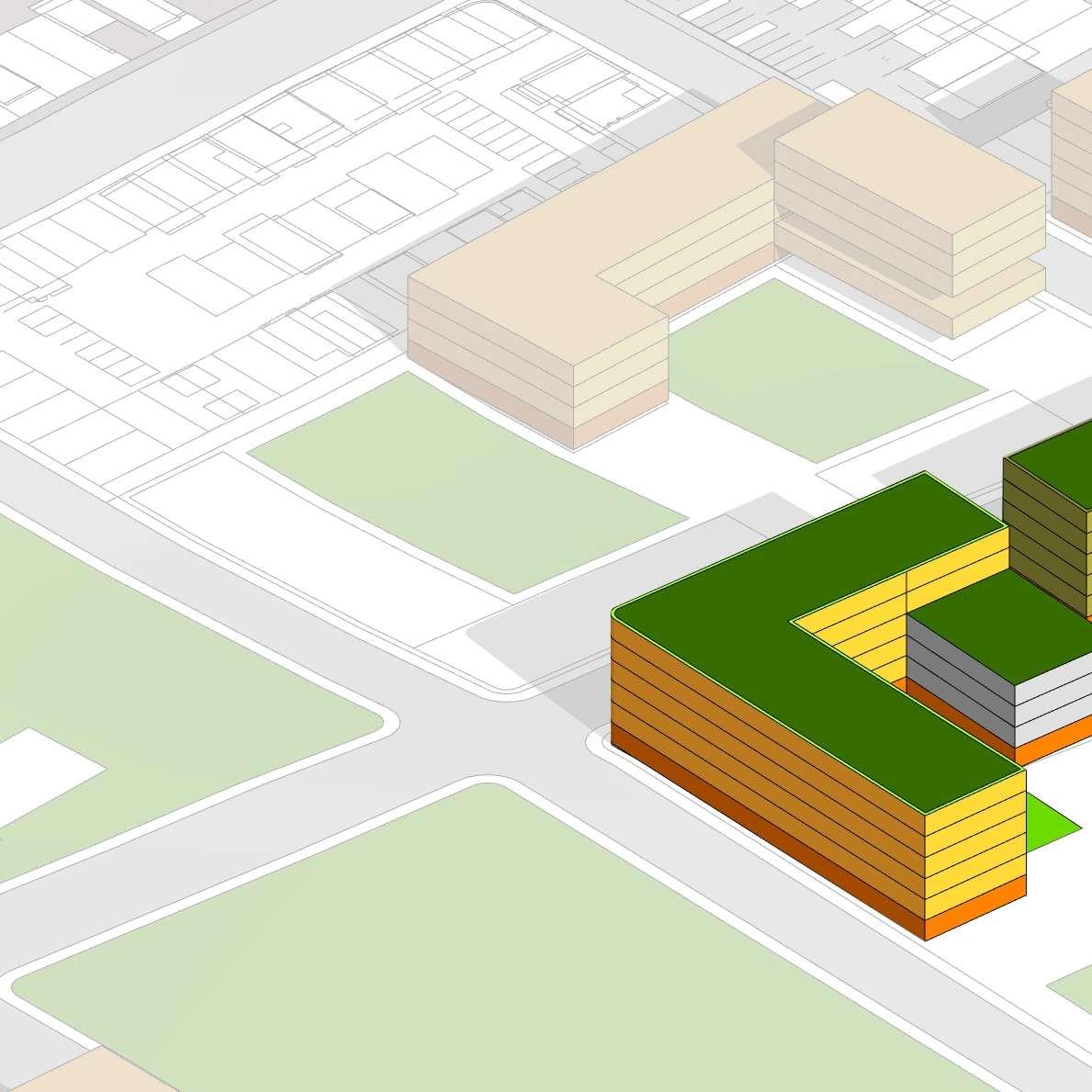 La disposición de estos volúmenes se enfoca en continuar con la morfología de la esquina de la manzana, aprovechando su relación con los patios interiores.