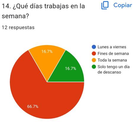 ENTREVISTARON, EL 66.7% RESPONDIÓ QUE FINES DE SEMANA, EL 16.7% RESPONDIÓ QUE TODA LA SEMANA Y EL OTRO 16.7% RESPONDIÓ QUE SOLO TIENEN UN DIA SE DESCANSO.