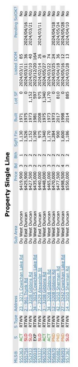 Beds: Kitchens: Int Feat: Status: MLS®: Pending: Listed: Taxes: Assessed: DOM: Baths: List: Sold: Extr Feat: 42-3050 Sherman Rd V9L 0E4 Du West Duncan 810sqft / 0.00ac Lot Size: 960882 Pending 2 2 1 $462,000 $270 $2,569 36 2024/04/18 2024/05/24 900 0 2017 1 Row/Twn