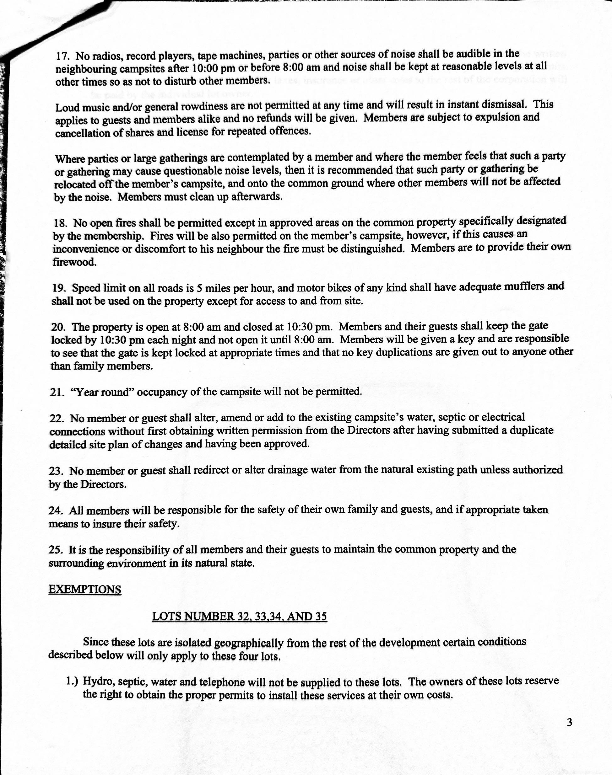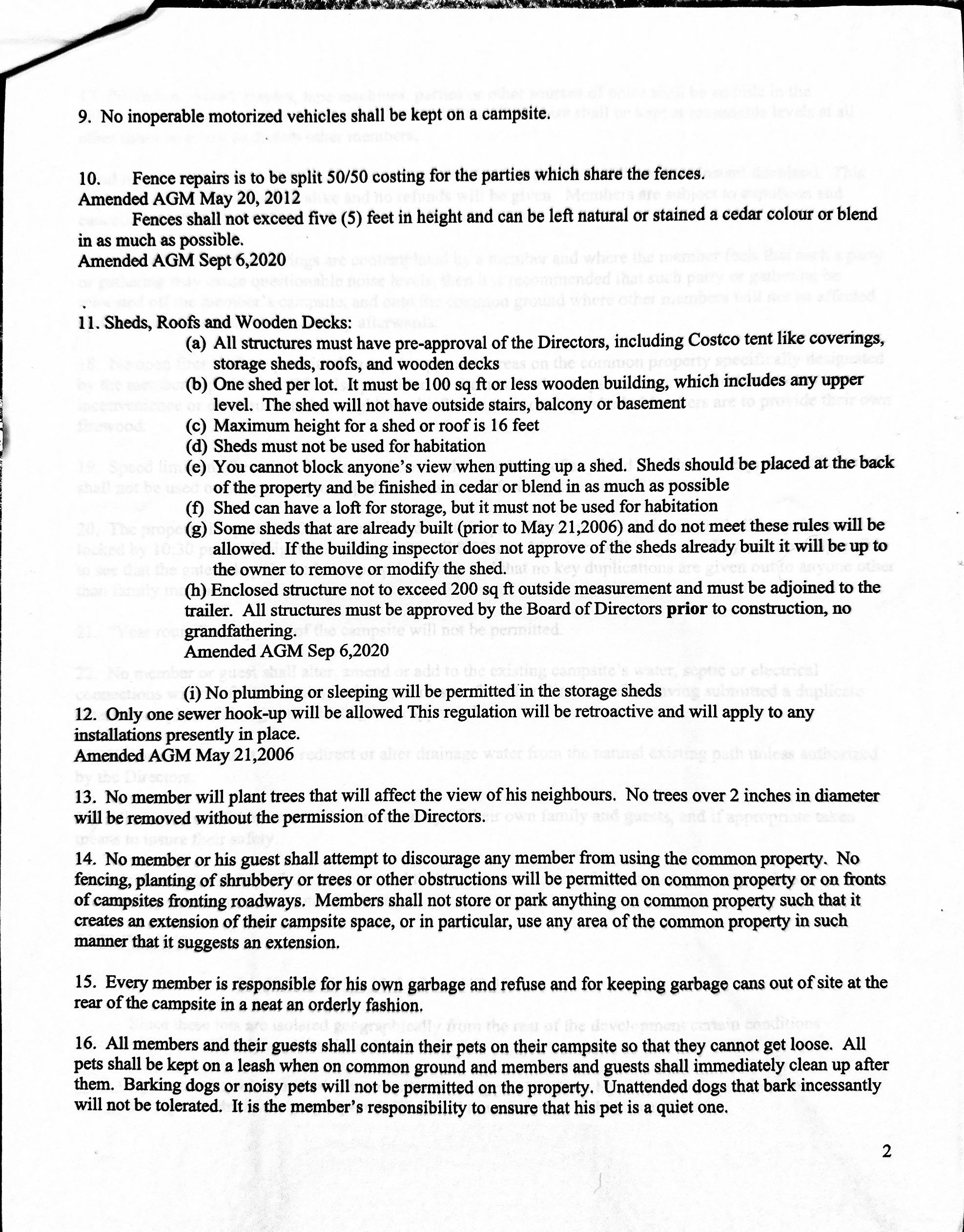 2.) These lots will be exempt from rule #11, any building larger than 8 feet by 12 feet will need the written permission from the closest neighbour, and the owners will have the right to apply for the legal permits. Any improvements that result in higher taxes, insurance or other costs to the rest of the corporation will be paid by the individual lot owner.