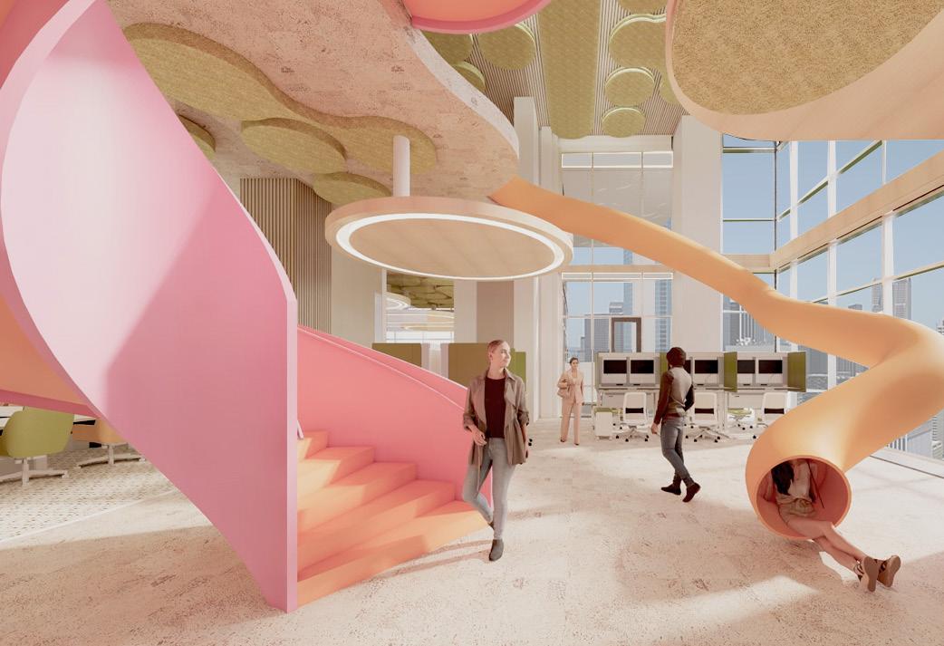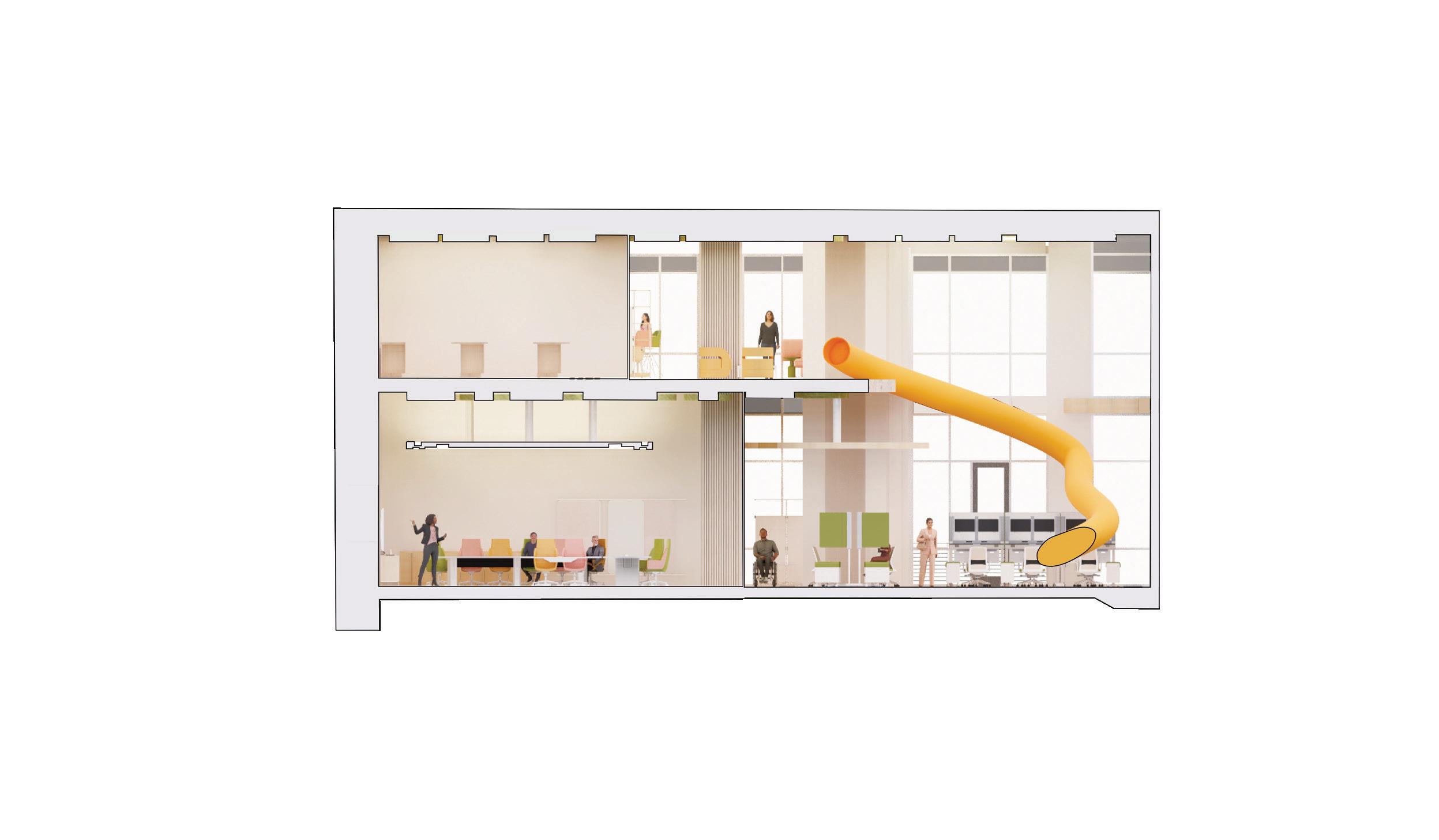 -The incorporation of monumental iconorgraohy such as the slide that reminds workers of the teamwork mentality often learned in childhood, while cultivating the oppourtunity for playful, collaborative interactions