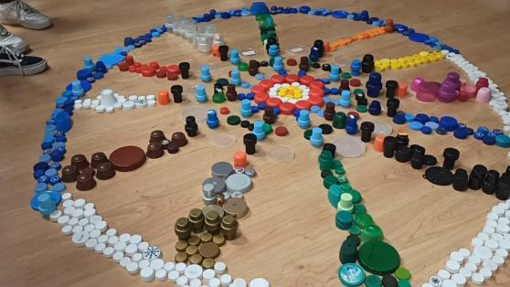 Jugamos con tapones a hacer mosaicos, mandalas o carteles.