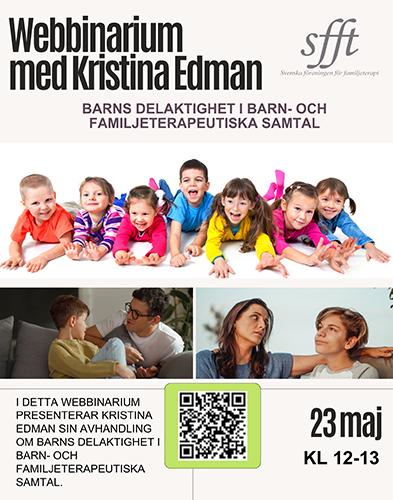Kristina Edman är doktorand vid Malmö universitet och forskar om barns delaktighet i barn- och familjeterapier Hon är även vetenskaplig sekreterare för Svenska Föreningen för Familjeterapi. Hon är socionom, legitimerad hälso- och sjukvårdskurator och jobbar familjeterapeutiskt