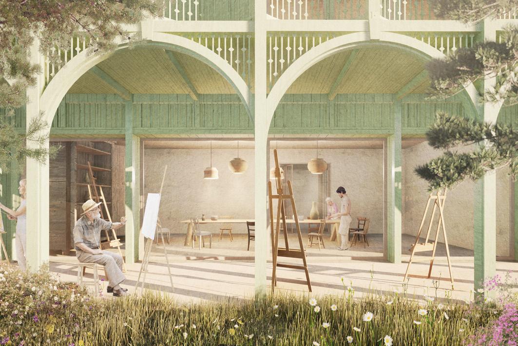 Being in close proximity to kindergartens, schools, and residential areas, the Re-Sanatorium seeks to fight the age gap and promote the exchange of passions and skills. Participating in various activities, collaborating in the shop, cafe, and organizing classes for children, all help to overcome the feeling of isolation and enhance quality of life. The community-centered design allows for passing valuable knowledge on to younger generations as well as sharing experiences between residing seniors.