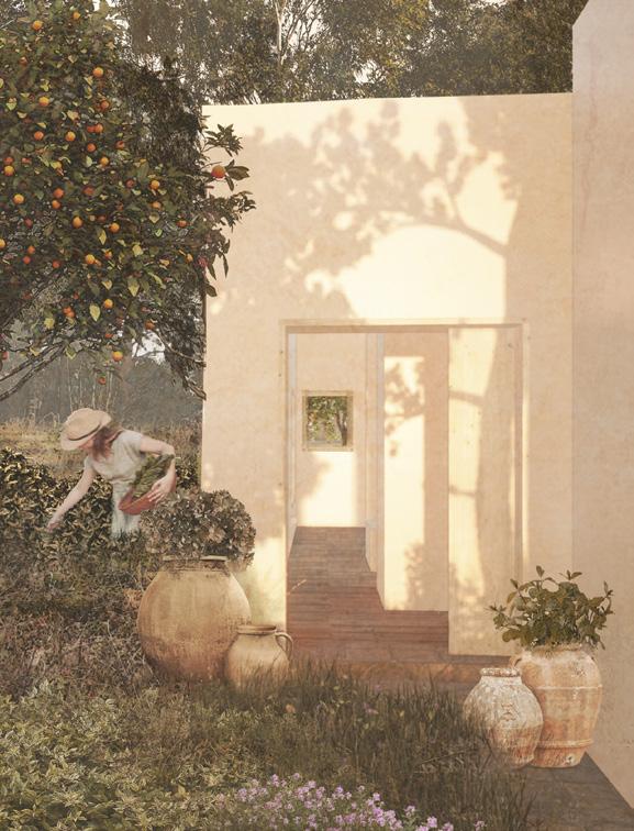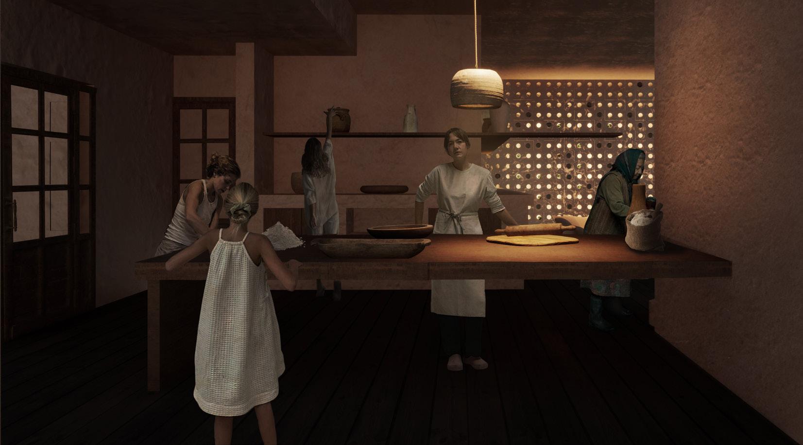 Adjacent to the foyer are a large wooden table and a pantry. To strengthen community sense, people gather around it and bake together the traditional Portuguese „pão”, which is further used in the olive oil tasting process. The elongated table flows seamlessly into a worktop connected to the woodfired oven. As smells have the power to bring back memories and help us navigate our surroundings, this space engages all of our senses.