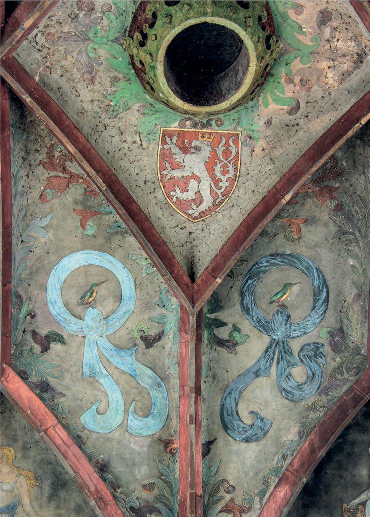 Staroměstská mostecká věž byla dokončována v době Václava IV. a heraldická výzdoba byla doplněna reliéfy ledňáčka v točenici (osobním královým znamením). Výmalba klenby ve Staroměstské mostecké věži. Snímek Štěpán Valecký.
