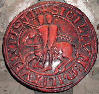 Sigillum militum Christi (Pečeť rytířů Kristových). Jedna z pečetí templářského řádu: dva rytíři sedící na jednom koni.
