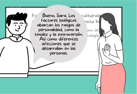 El profesor Shelton esta explicando en la clase los factores biológicos y culturales que influyen el corportamiento humano. Al terminar la clase, uno de sus estudiantes se acerca para preguntarle mas acerca del tema porque no le quedo muy claro.