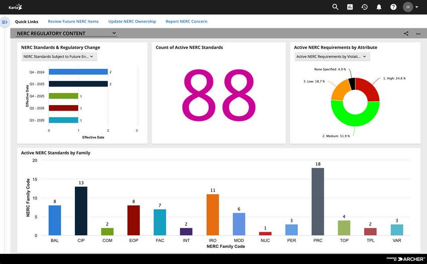 Karta’s NERC Compliance Management Solution is built on the Archer Integrated Risk Management (IRM) platform. Existing Archer users will appreciate the seamless all-in-one experience, and organizations new to Archer can rest assured that this tool is built on one of the best compliance management platforms in the world