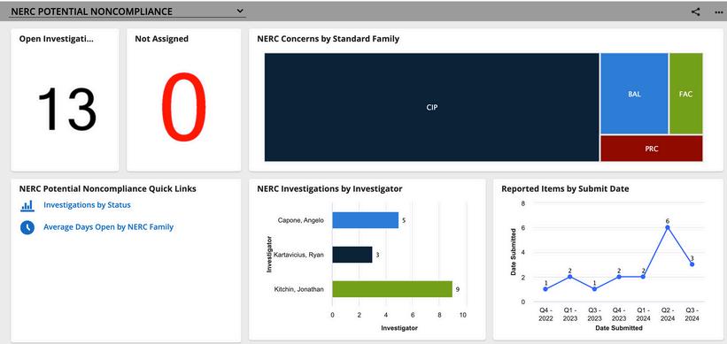 Collecting employee-reported NERC concerns & organizing for NERC self-reportingManage investigations related to potential noncompliance of NERC standards and export investigation results into the required NERC reporting template.