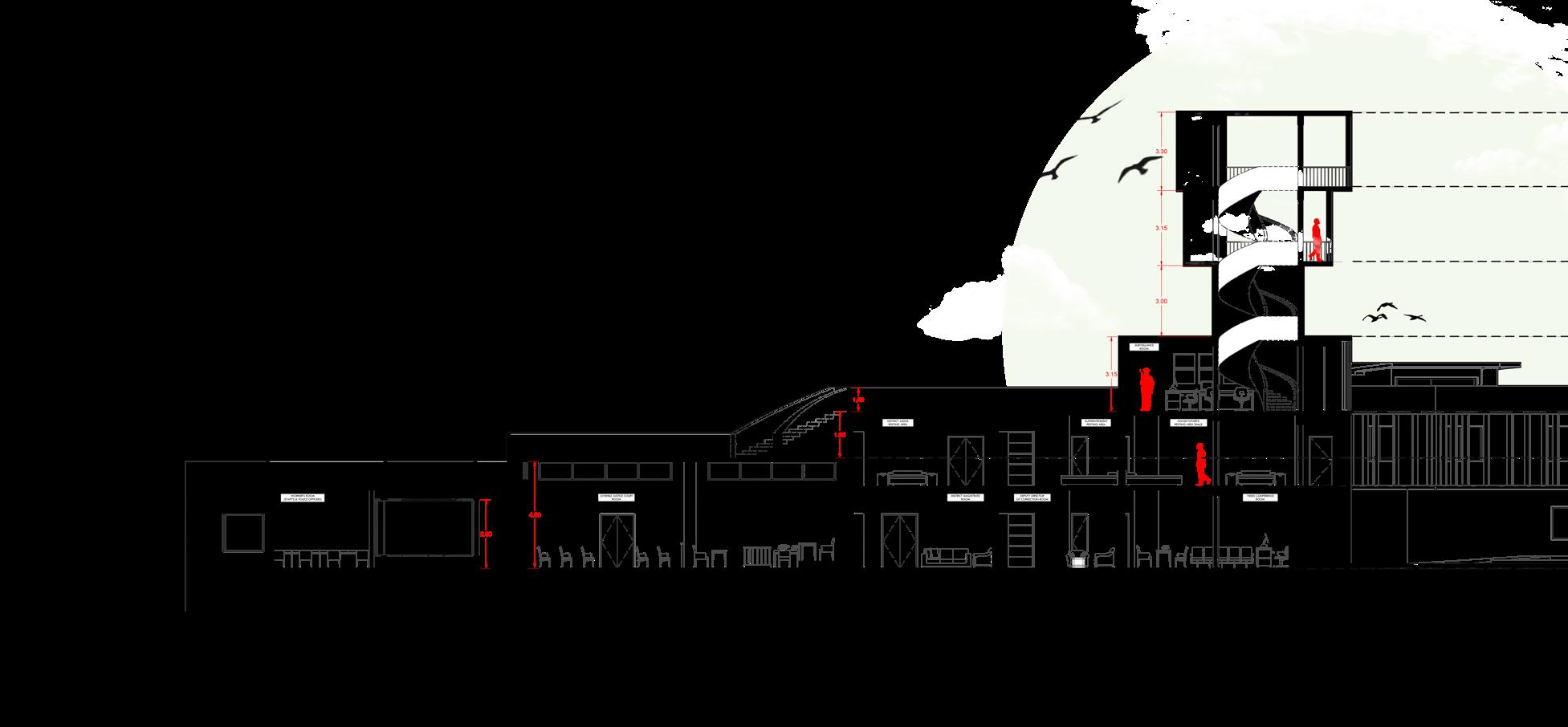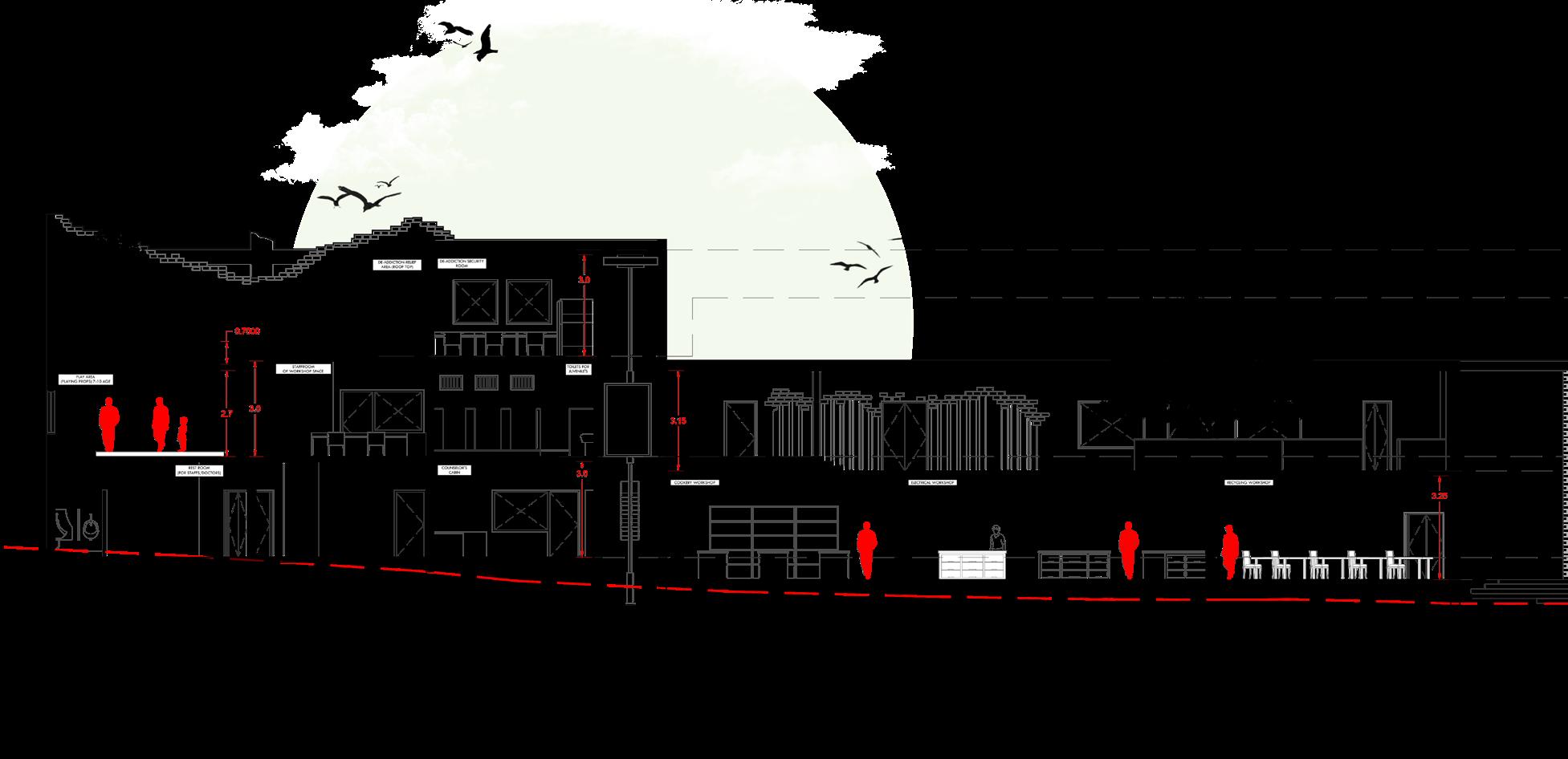 According to the past escape rate of Chengalpattu juvenile home, extra layer of defence is required in the design. That adds an extra height of 3m with 6m from the Prison code of India to the compound walls with the pathway over the walls that adds the surveillance to oversee the juvenile by correction officers.