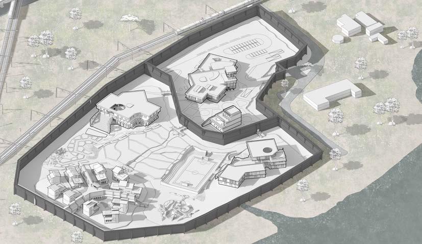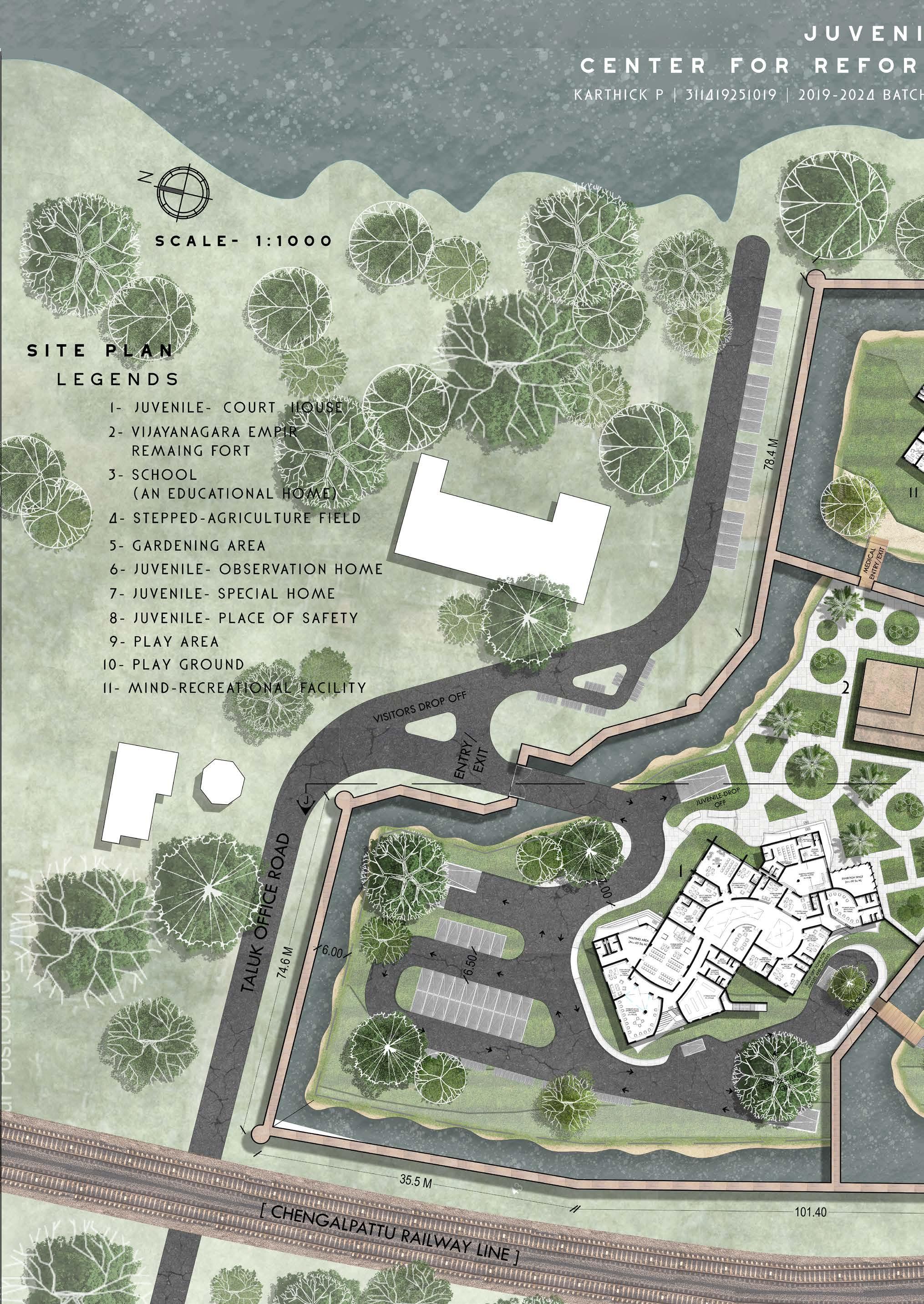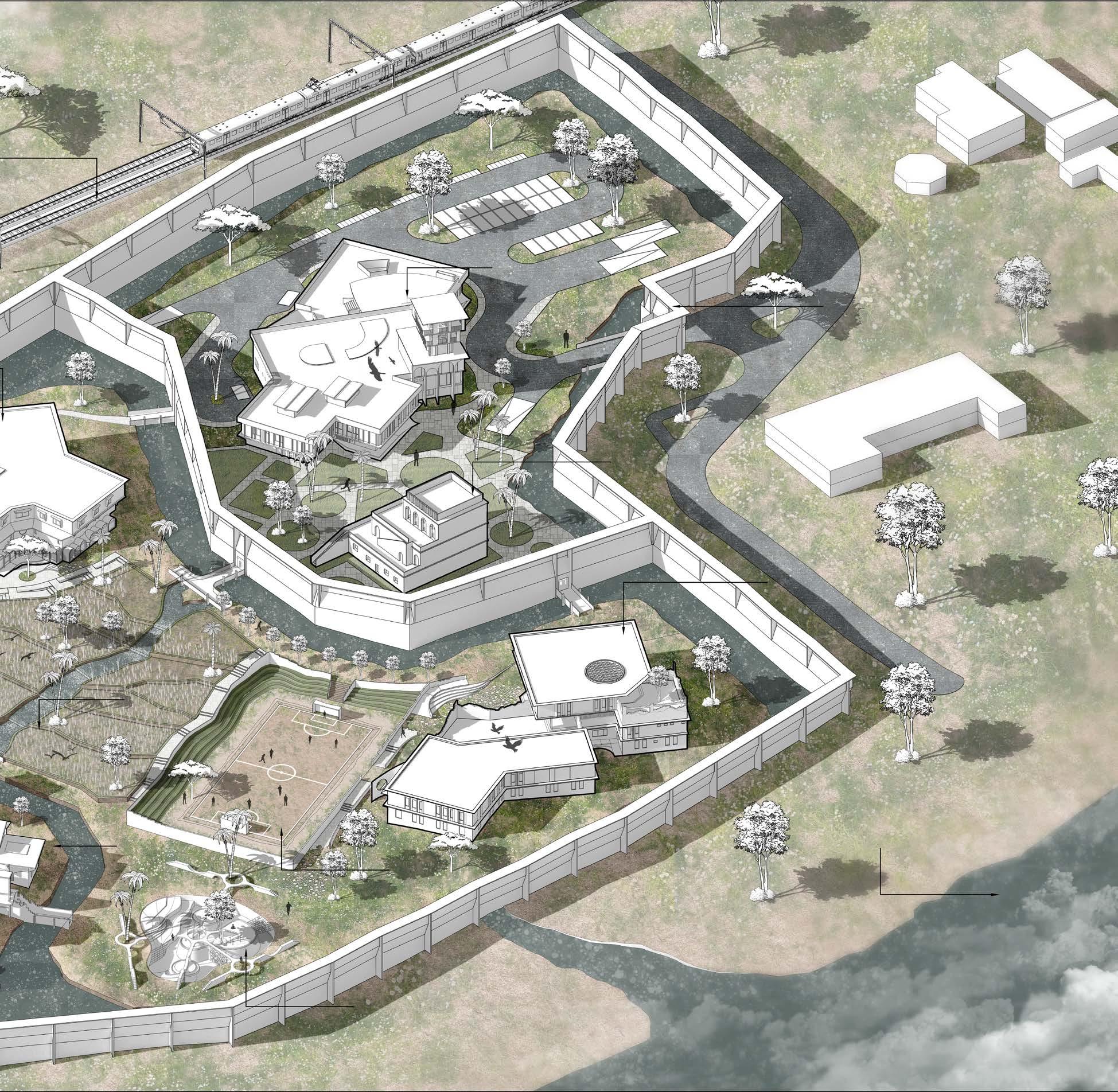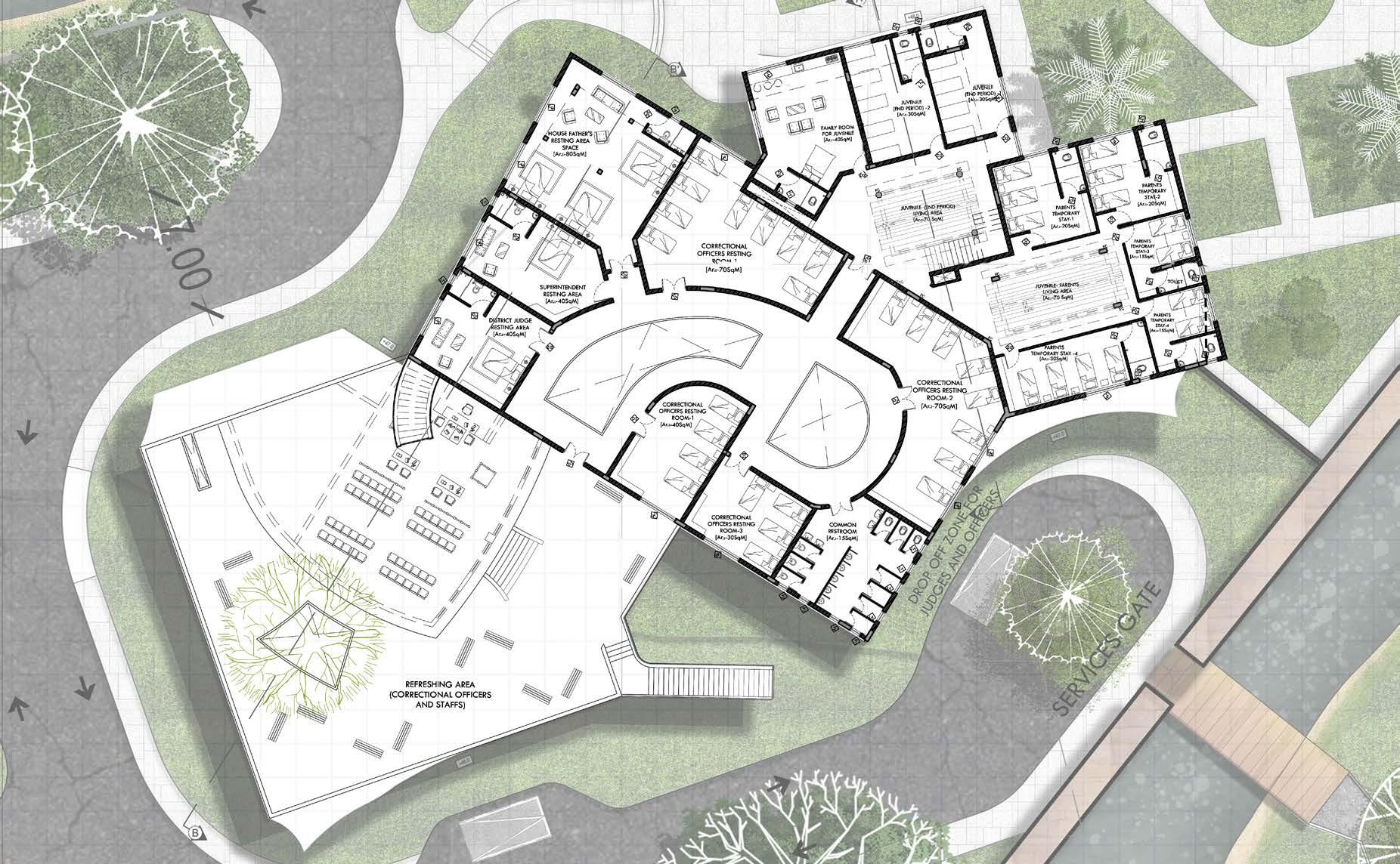 The zonning of three different juvenile homes will be placed according to the site contour lowest point that makes correctional officers to watch them from admin-watch tower and schools and recreational spaces are located between admin area and residential area of juvenile