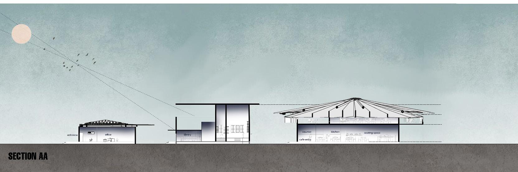 Located at high ground for better view of east side of site rich in vegetation.The form of library is a superimposition of convex curves on one another.