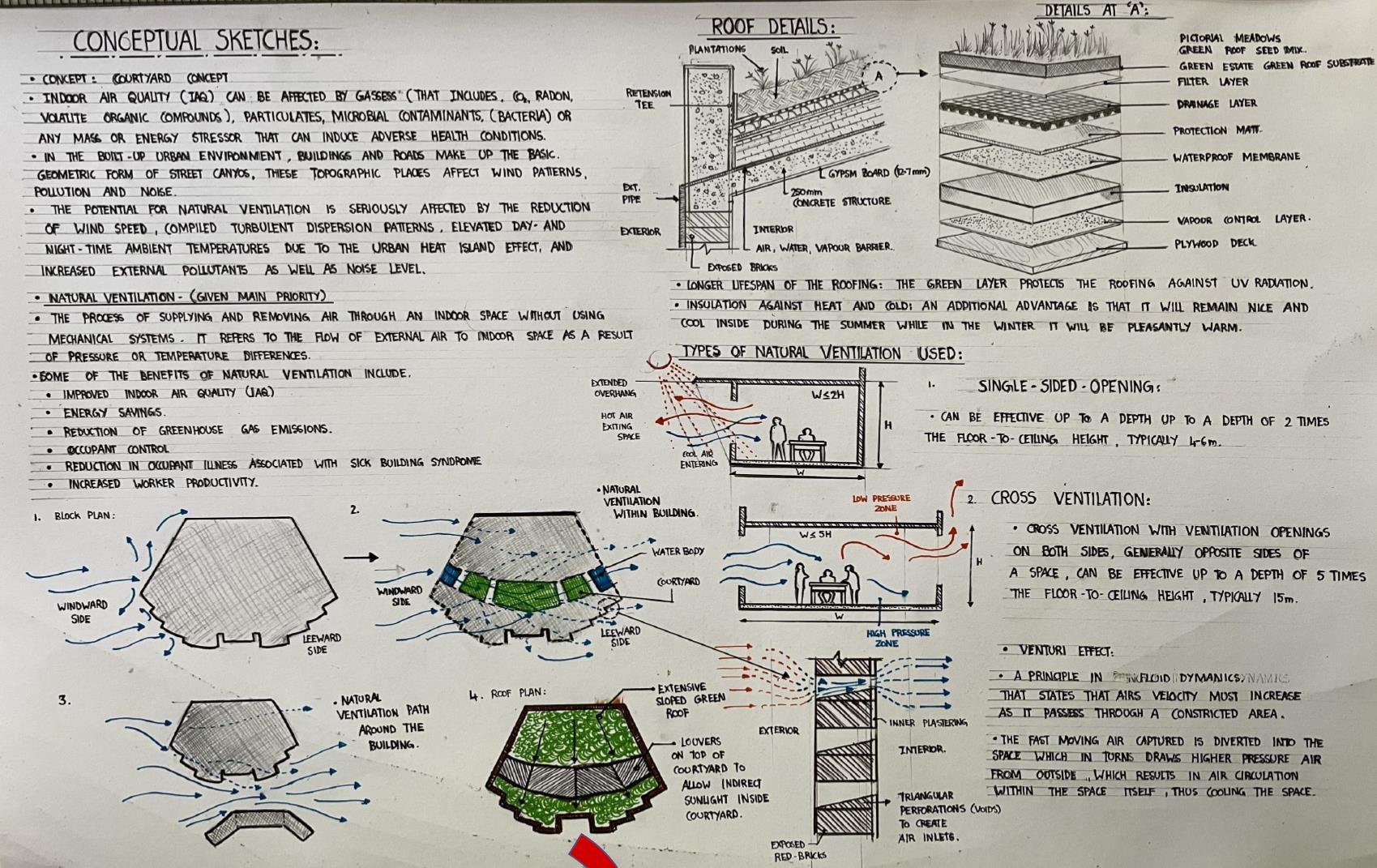 SO, THE ENTIRE CIRCULATION SPACE WITHIN THE BUILDING BLOCKS (MAIN FOCUS ON THE ACADEMIC BLOCK), IN THE EAST WEST DIRECTION, THAT FACILITATES THE PREVALENT SOUTH WEST BREEZE TO VENTILATE IT NATURALLY.