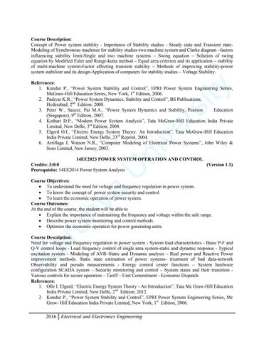 Course Objectives: To understand the need for voltage and frequency regulation in power system. To know the concept of power system security and control. To learn the economic operation of power system. Course Outcomes: At the end of the course, the student will be able to Explain the importance of maintaining the frequency and voltage within the safe range. Describe power system monitoring and control methods. Optimize the economic operation for power generating units.