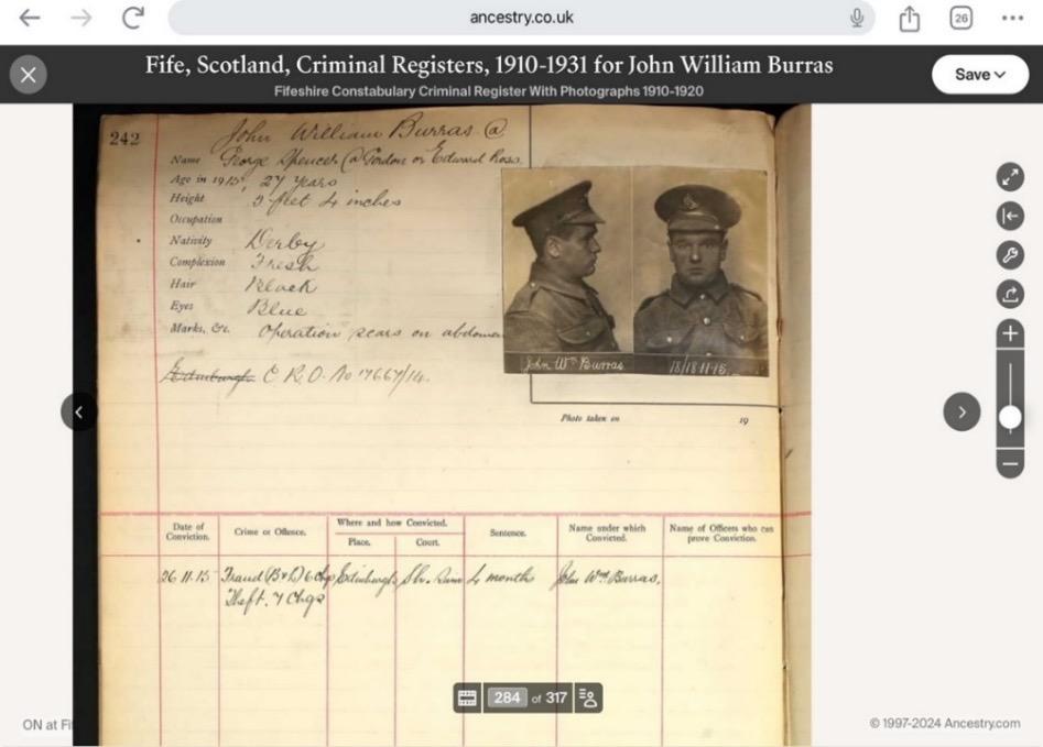In November 1915 J W Burras was found guilty of theft and served four months in prison. The army record gives other aliases: George Spencer, Gordon or Edward Ross. It also shows his photo (shown below left).
