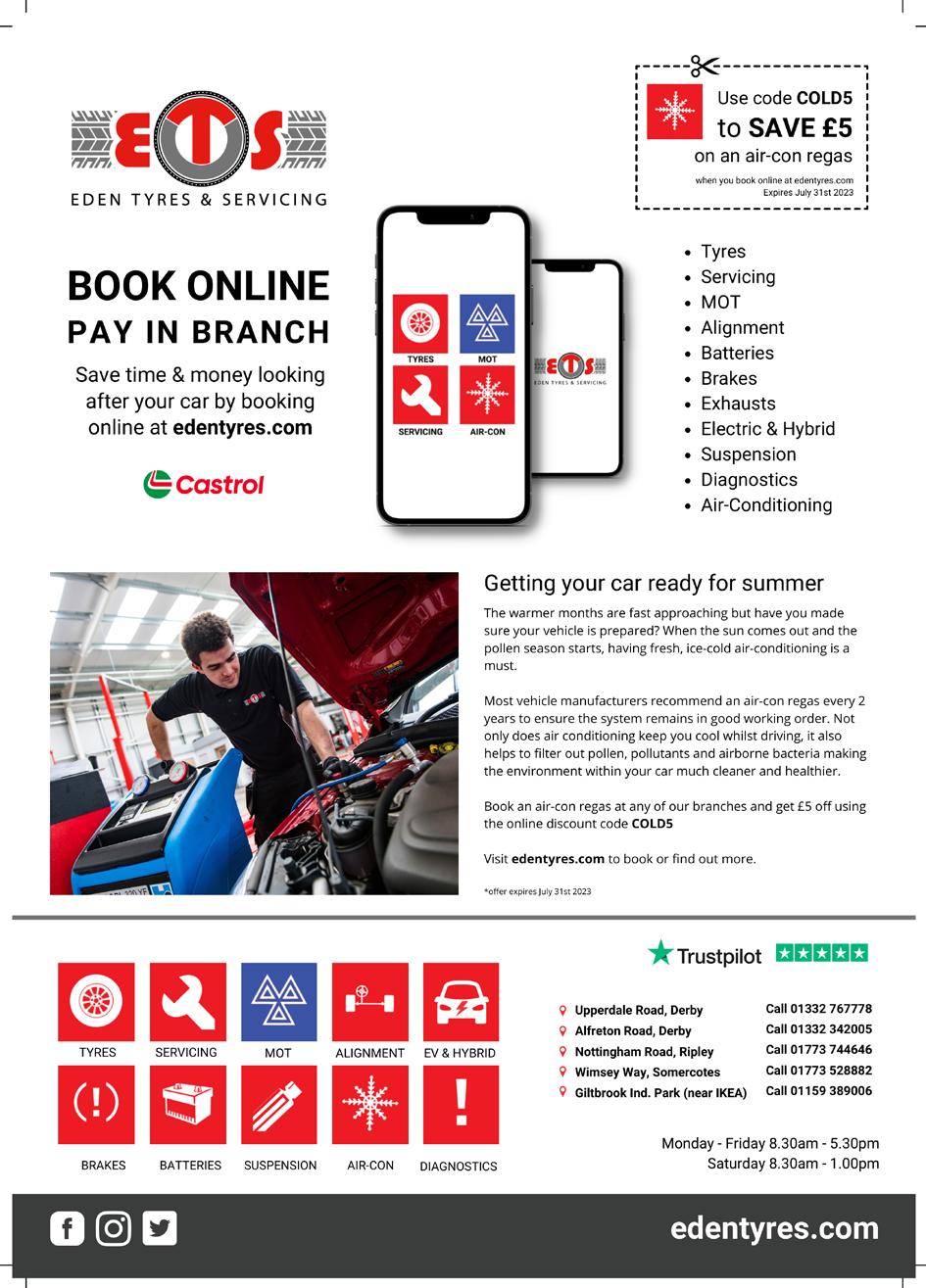VILLAGE EDITION Your independent community magazine CONNECTING LOCAL PEOPLE WITH LOCAL BUSINESSES Issue 96 | FREE Delivered to 13,500 homes & businesses • Breadsall • Coxbench • Denby • Duffield • Hazelwood • Holbrook • Horsley • Horsley Woodhouse • Kilburn • Little Eaton • Makeney • Mapperley • Milford • Morley • Smalley • Stanley Common • Stanley Village • Areas of Ripley June / July 2023 Packed full of useful information and local advertisers Inside: Win a 2 Course Sunday Lunch for 2 People at The Kedleston Country House Win a bottle of Champagne FREE FLOWERSNominate someone deserving! BEST VALUE TYRES FOR ALL VEHICLES 182 Derby Rd, Denby DE5 8RD (Opposite The One Stop Shop) 01332 883103 FAST 'WHILE YOU WAIT' FITTING SERVICE NO APPOINTMENT NEEDED Scan to get prices for your tyres NOW