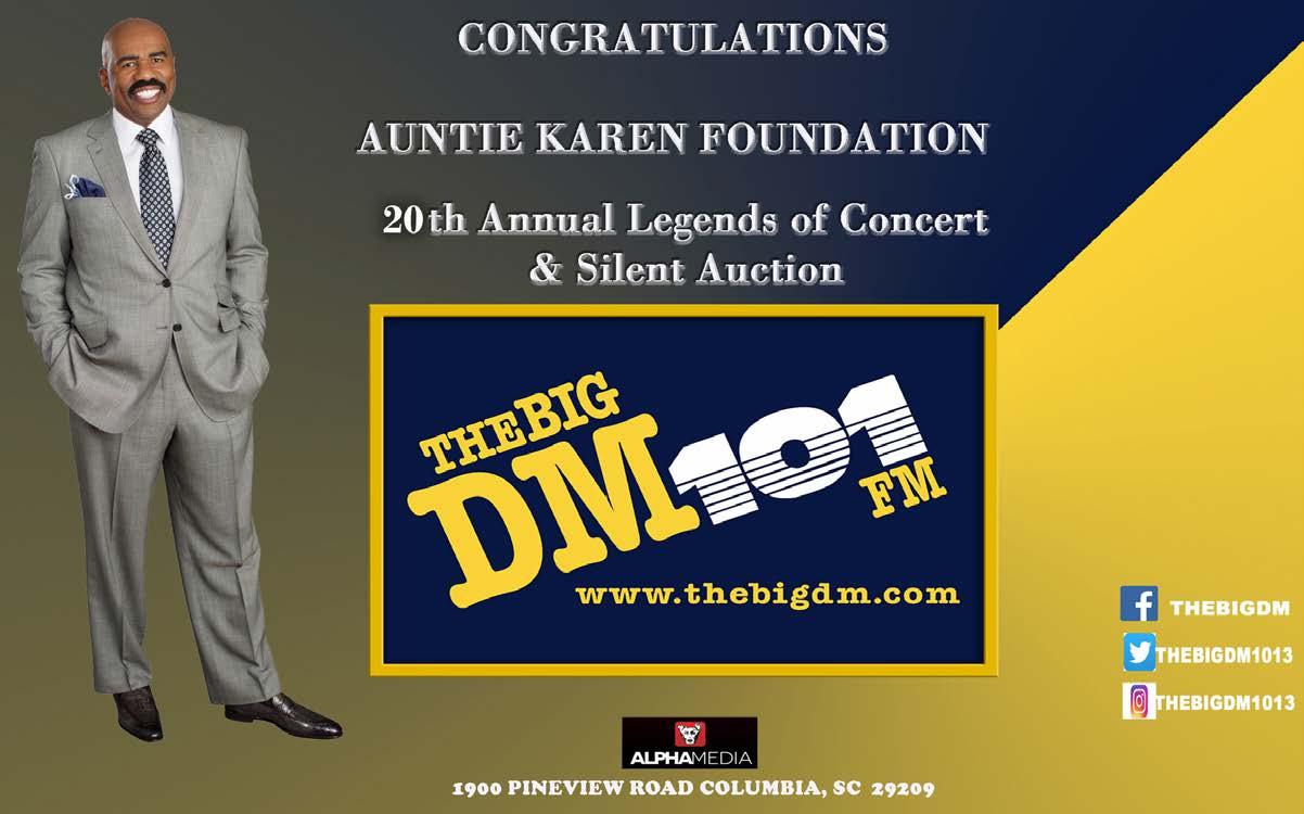 The Auntie Karen Foundation, a global non-profit based in South Carolina, is dedicated to creating and implementing a series of community outreach programs that empower, enlighten, and educate through the arts. The Legends of Concert series serves as the foundation's signature fundraiser, supporting its mission to preserve the legacy of African-American music.