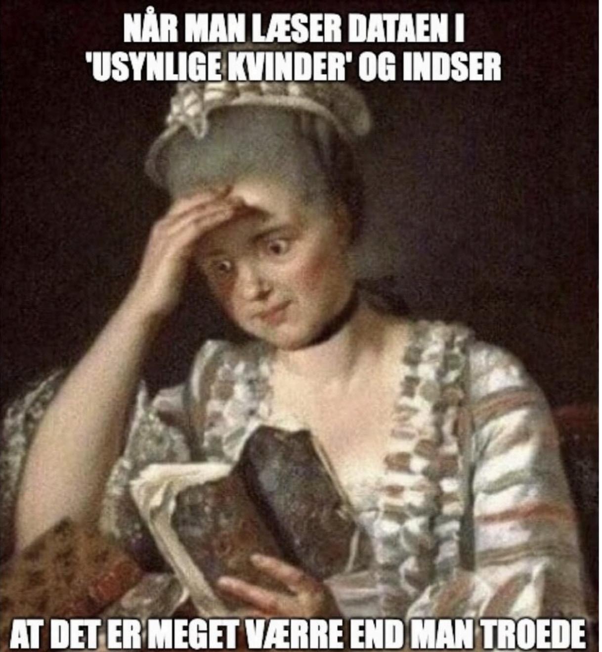 kvinde eller feminist for at føle. I stort set alt data brugt til at forme verden, som vi kender den, er kvinder underrepræsenteret, hvis overhovedet repræsenteret. Bogen er fyldt med konkrete eksempler, data og verdensdele berørt af dette faktum.