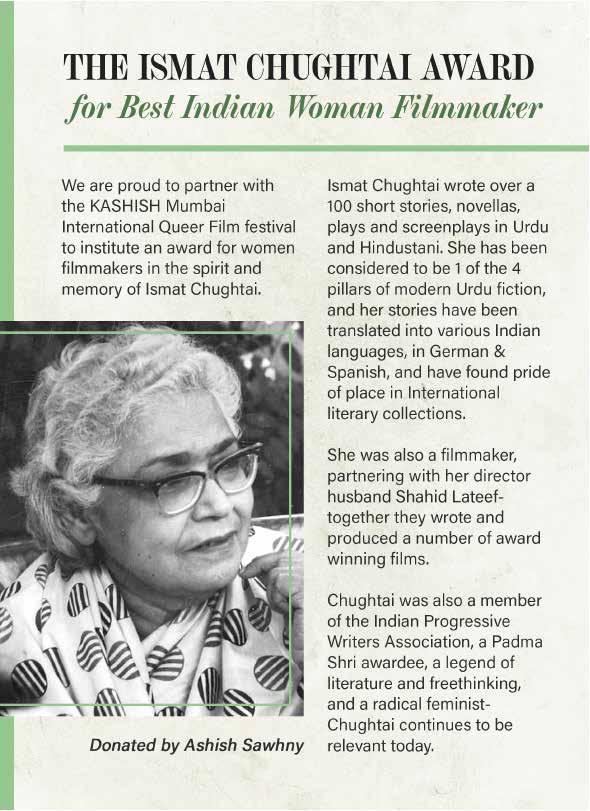 Instituted in memory of renowned novelist, short story writer, liberal humanist and filmmaker Ismat Chughta, this award is an attempt by KASHISH to acknowledge and encourage female voices in the Indian queer cinema. Indian woman filmmakers residing in India, whose first or second narrative film completed after January 1, 2023 and playing at KASHISH 2024, are eligible for nomination under this award category. The award, supported by Chughtai's grandson and filmmaker Mr. Ashish Sawhny, carries a KASHISH Butterfly Trophy and a cash prize of Rs.20,000. Additionally all nominated filmmakers receive free subscription for IMDB Pro for a year, supported by IMDb.