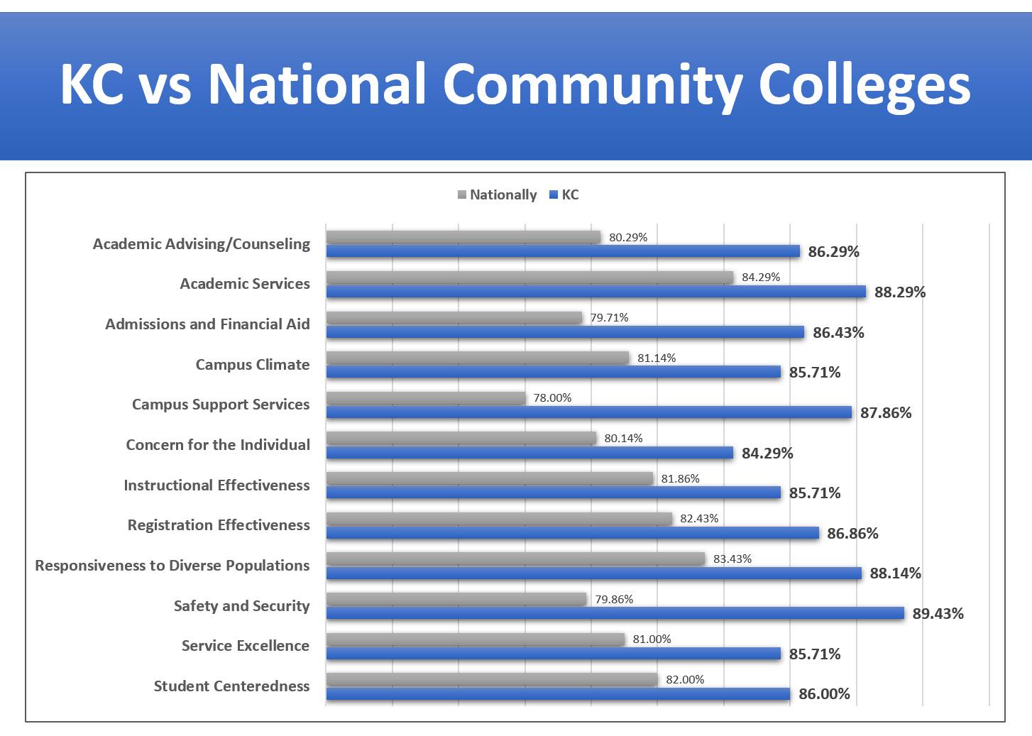 In fall 2021, Kaskaskia College administered the national *Noel-Levitz Student Satisfaction Inventory (SSI) survey. The Noel-Levitz SSI survey assessed how well the college meets students’ expectations by asking students to rate importance and satisfaction. Over 400 KC students responded about their satisfaction in various campus topics. Below is a summary of how Kaskaskia College fares compared to the national average. #SuccessStartsHere