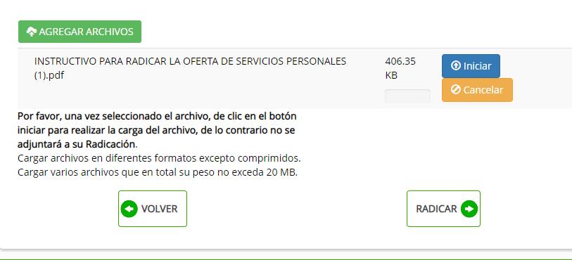 Para adjuntar los archivos debe seleccionar la opción Agregar Archivos y hacer click en la opción “Iniciar”