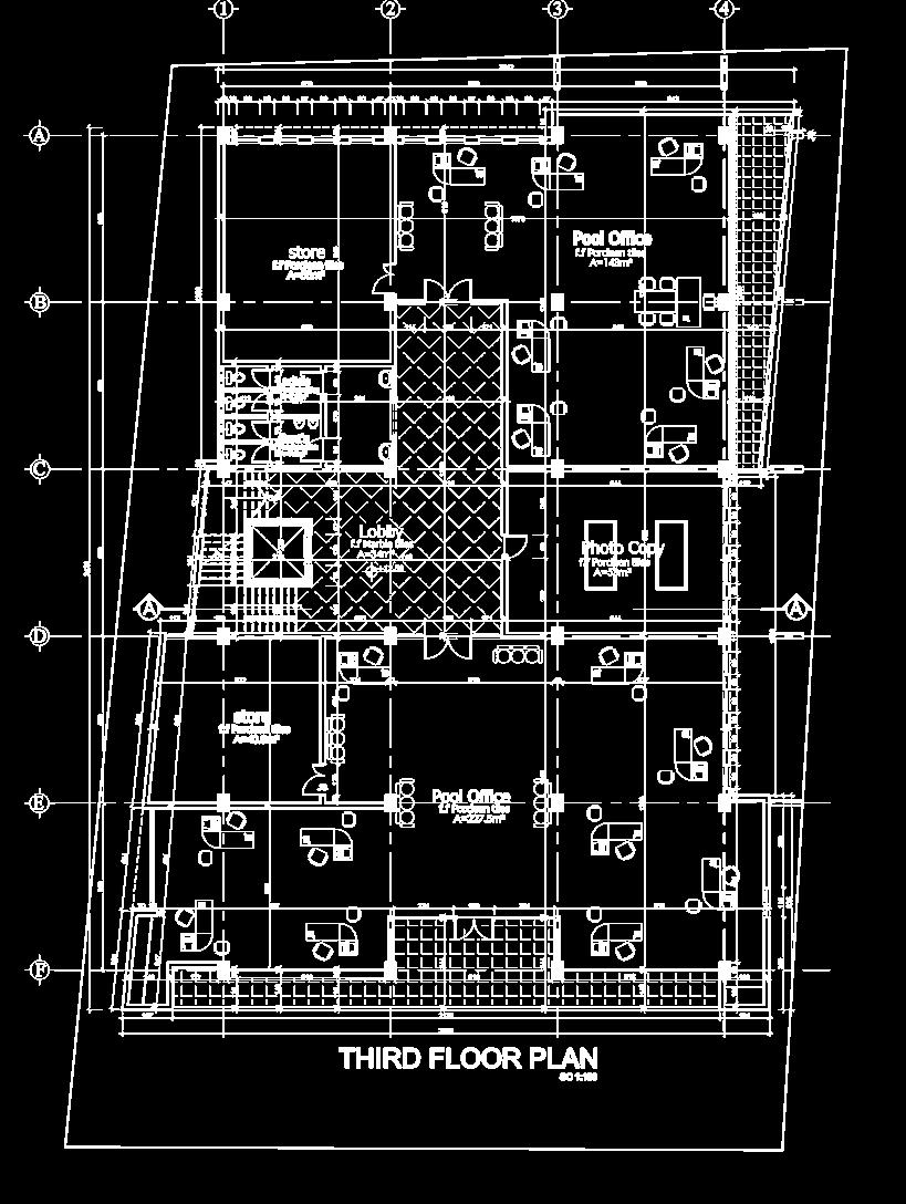 The ground floor, mezzanine floor, first and second floor are used for Cafeteria/ Restaurant and shops, third and fourth floor are for office. The below first and third floor plans are the same with the floor above with minor differences. As you can see on the 3D renderings the shops and the offices floors are defined with form and material.