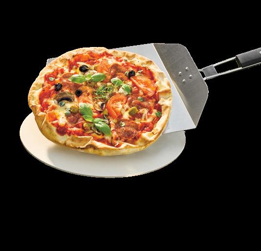 kamena ploča od kvalitetnog kordijerita (može se koristiti i za pripremu flambiranih kolača i pečenje kruha), lopatica s preklopnom drškom od plemenitog čelika, poklopac