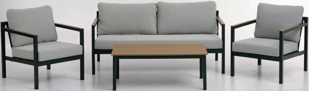 Stol: Aluminij i nauljeno FSC® tvrdo drvo. Š90xD150xV75 cm. Stolice: Aluminij, tekstilen i nauljeno FSC® tvrdo drvo. Mogu se slagati jedna na drugu. Stol 249 € 185 € / 1876,09 kn