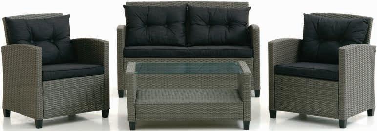 Stol: Plastika s UV-zaštitom. Š78xD59xV43 cm. Dvosjed i stolice: Plastika s UV-zaštitom. S jastucima.