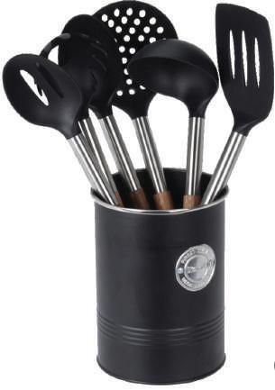 Držač za kuhinjski pribor, 1 set 7 kom sadrži: držač, lopaticu, kuharsku žlicu, žlicu s rupicama, lopaticu za cijeđenje, kutlaču i žlicu za špagete 7 kom €
